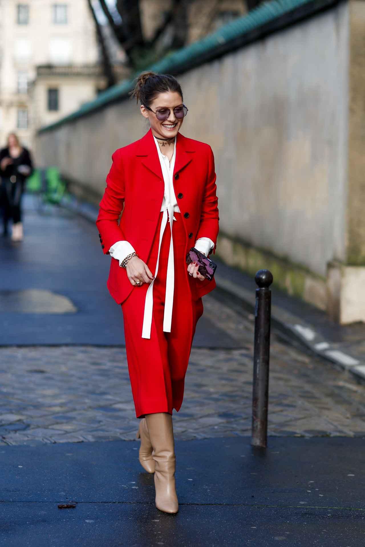 多くのセレブも出席したDiorのショーには、存在感を示すDiorの赤のパワースーツで出席。中には細いリボンがついた白ブラウスでクラシックに。足元はPRADAのベージュブーツで。