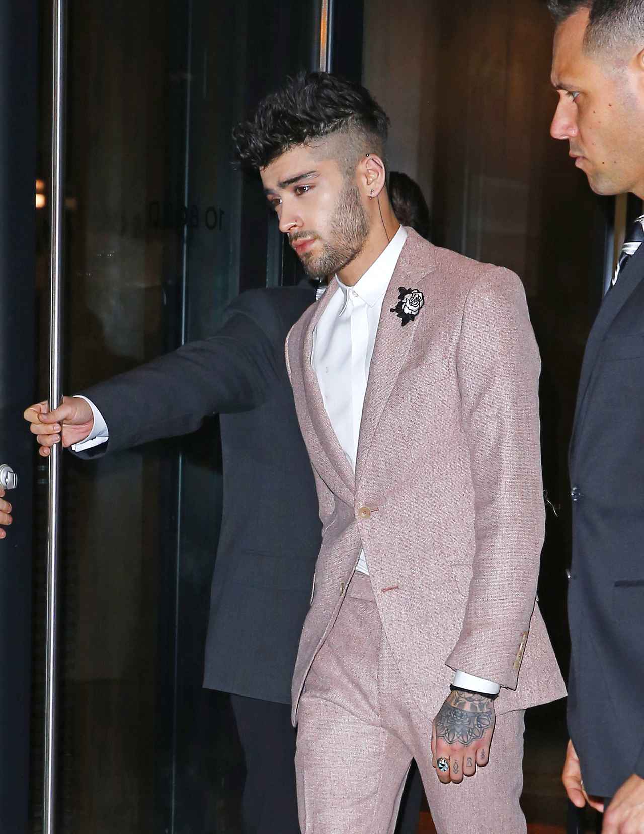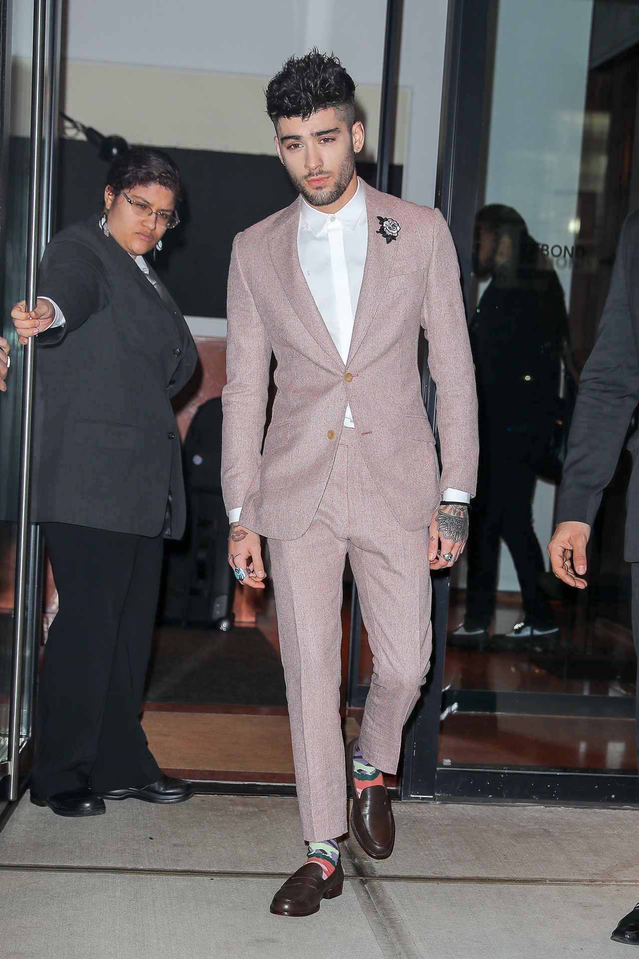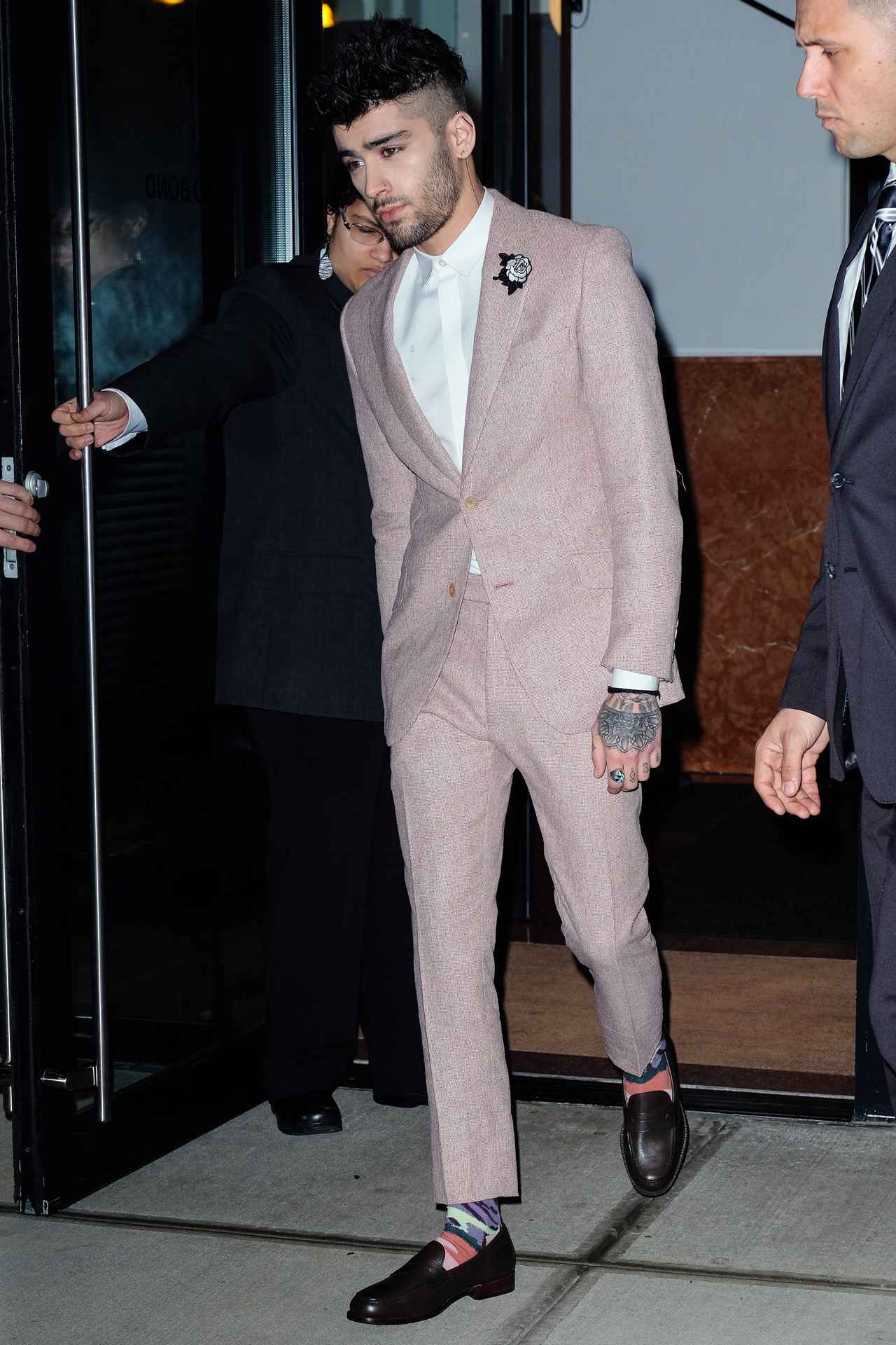グラミー賞に向かうために建物から出てきたゼイン・マリクは、ピンクのスーツに恐竜のくつ下という、遊び心のあるスタイル。