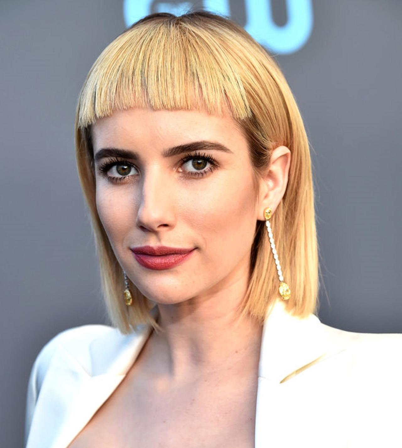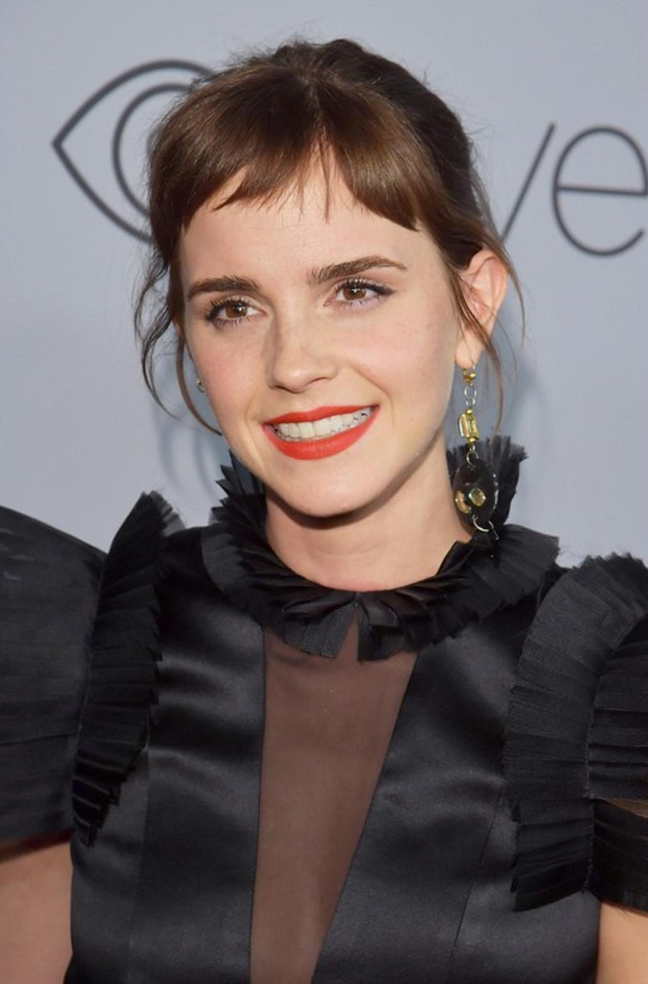 一直線に切ったブラントカットのベビー・バングスで個性と強さを主張したエマ。シンプルな洋服もベビー・バングスなら一気におしゃれ度がアップして見える。