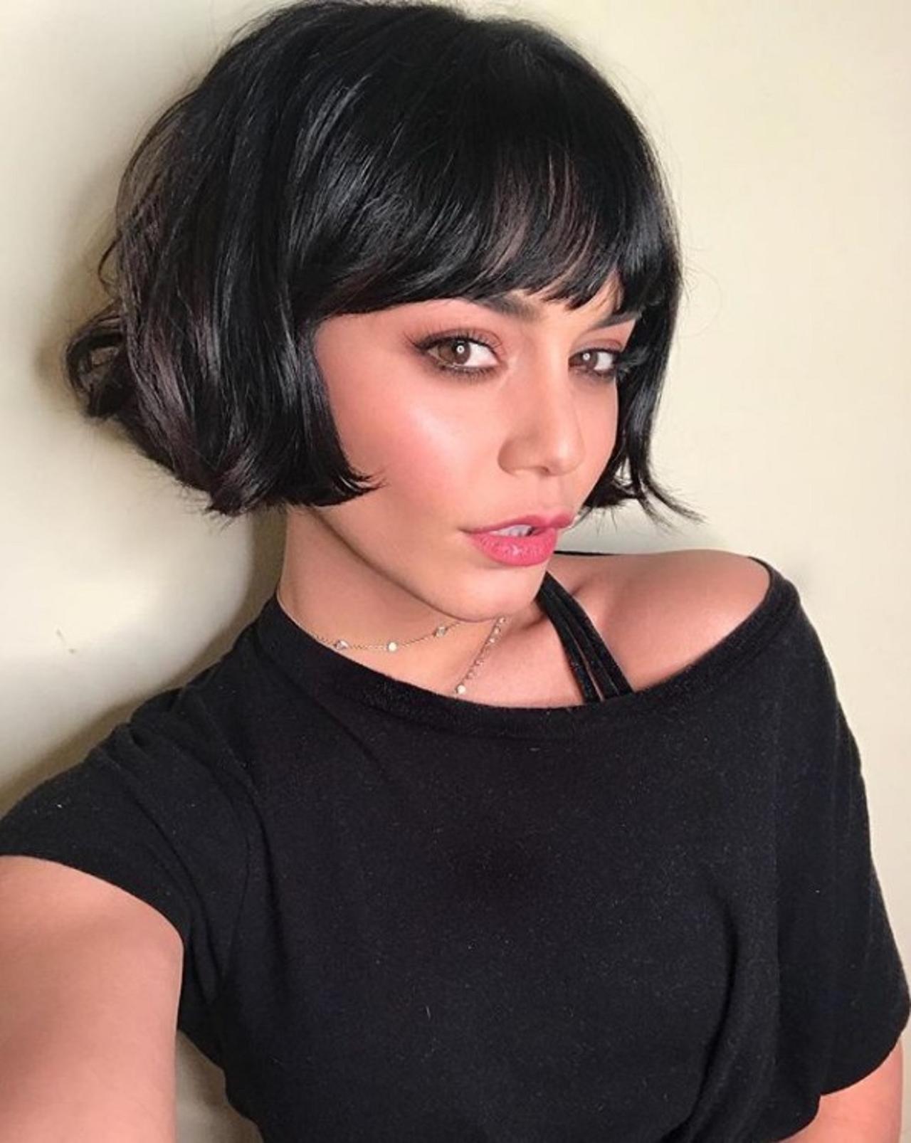 顎より上のボブヘアにバッサリとイメチェンしたヴァネッサは、前髪も眉毛よりも2㎝ほど上にくるようにカット。縦にハサミを入れるのではなく、横にぱっつんと切った重みのあるラインをカールをつけて流して。
