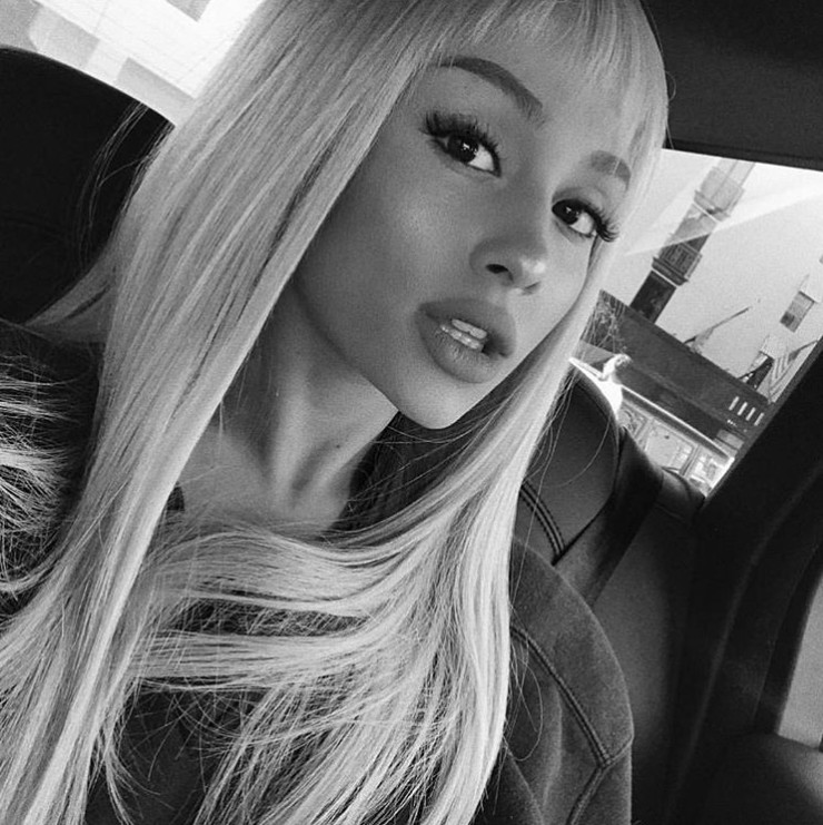 プラチナブロンドのストレートヘアに眉上3㎝以上のベビーバングスのウィッグをONしたアリアナ。いつもおでこを出したポニーテールが多いだけに、ダウンヘア+前髪のスタイルはかなり新鮮。
