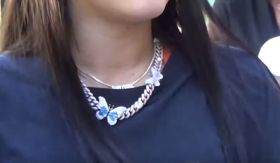 動画の中でカイリーは、「Baby Girl(ベイビー・ガール)」という文字ネックレスとともに、20歳の誕生日にトラヴィスからプレゼントされた蝶モチーフのネックレスを着用。