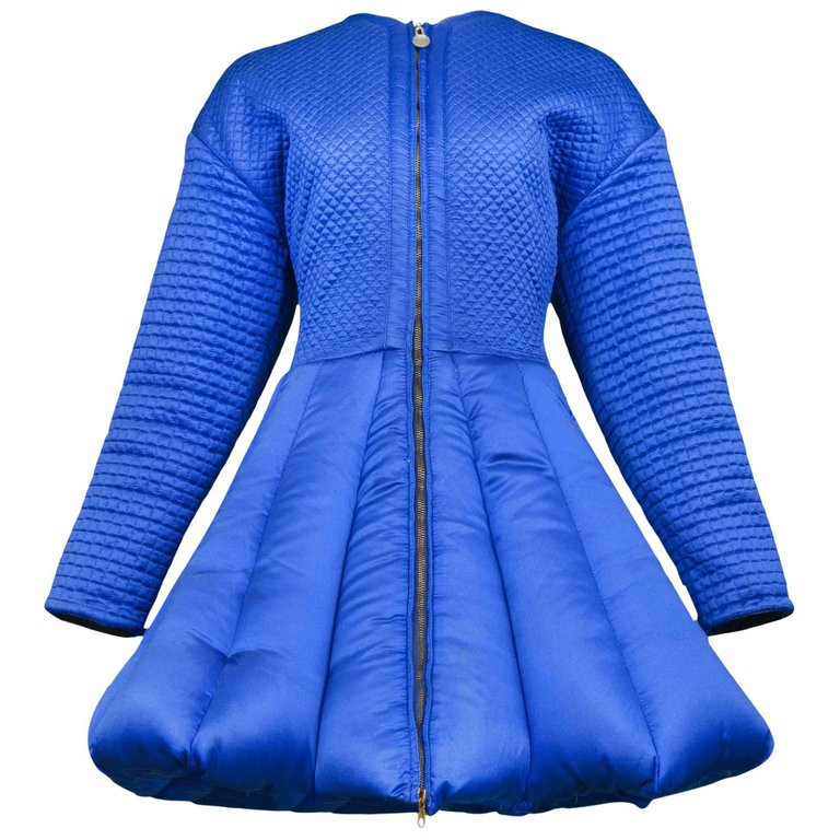 まさにアリアナのために作られたかのような、腰のあたりからフレアになったブルーのダウンコートはVERSACEの90年代のヴィンテージアイテム。アリアナはこのダウンコートをワンピース風に着こなした。ブーツは上のコーデと同じSAINT LAURENT。