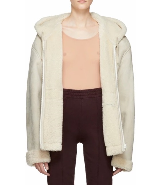 ボイシ州立大学のスウェットをミニワンピースとして着たアリアナは、そこにカニエ・ウェストのブランドであるYEEZYのビッグムートンジャケットを羽織って。わざとオーバーサイズアイテムだけを合わせることで、「彼から借りた」風に仕上がり、カジュアルアイテムなのに女の子らしくまとまる。