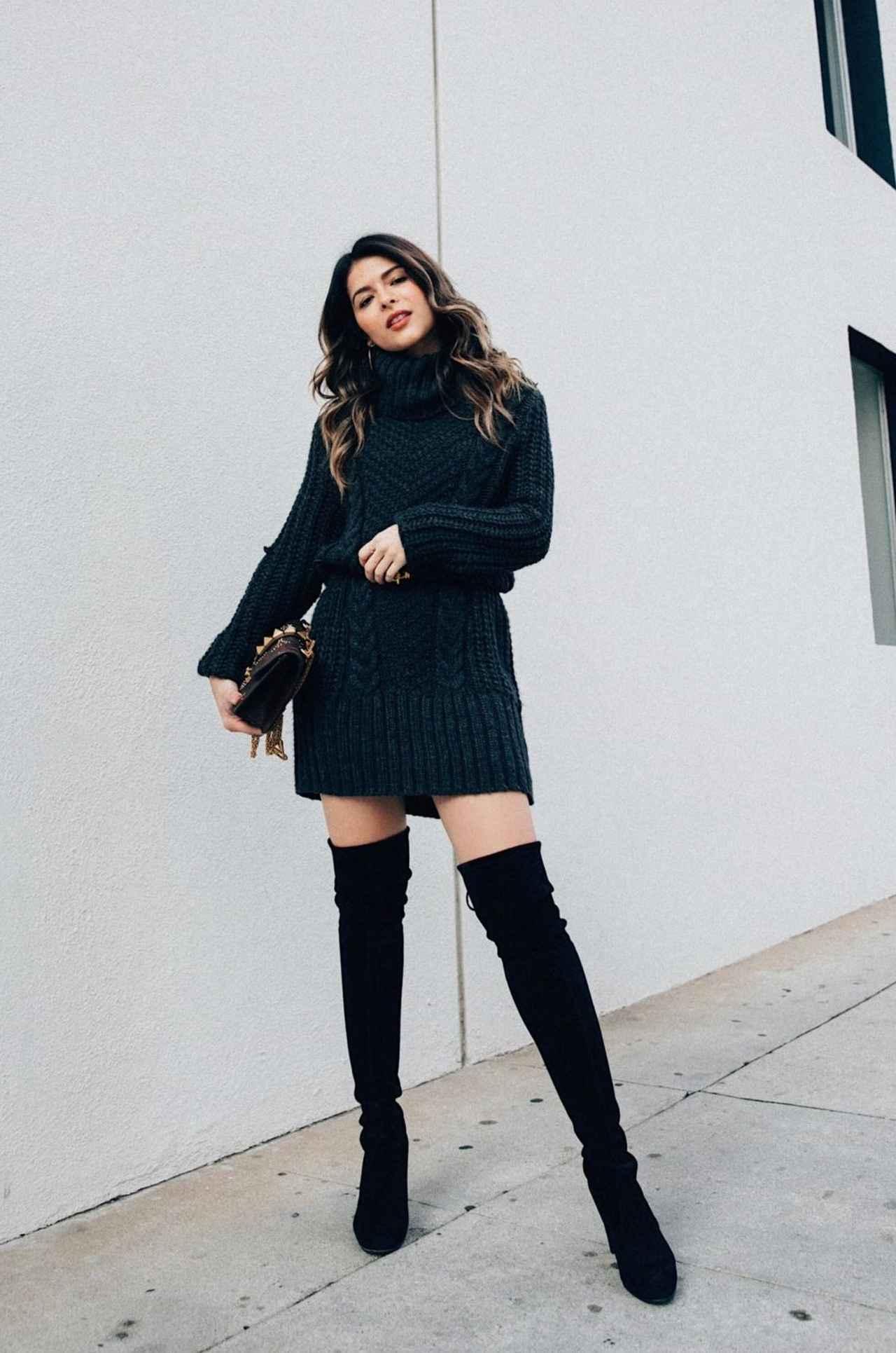 H&Mのニットワンピースには、STUART WEITZMANのサイハイブーツを合わせて肌の絶対領域を見せるのが正解。太ベルトより細ベルトでレディライクにまとめて、スタッズ付きバッグをクラッチ風に。