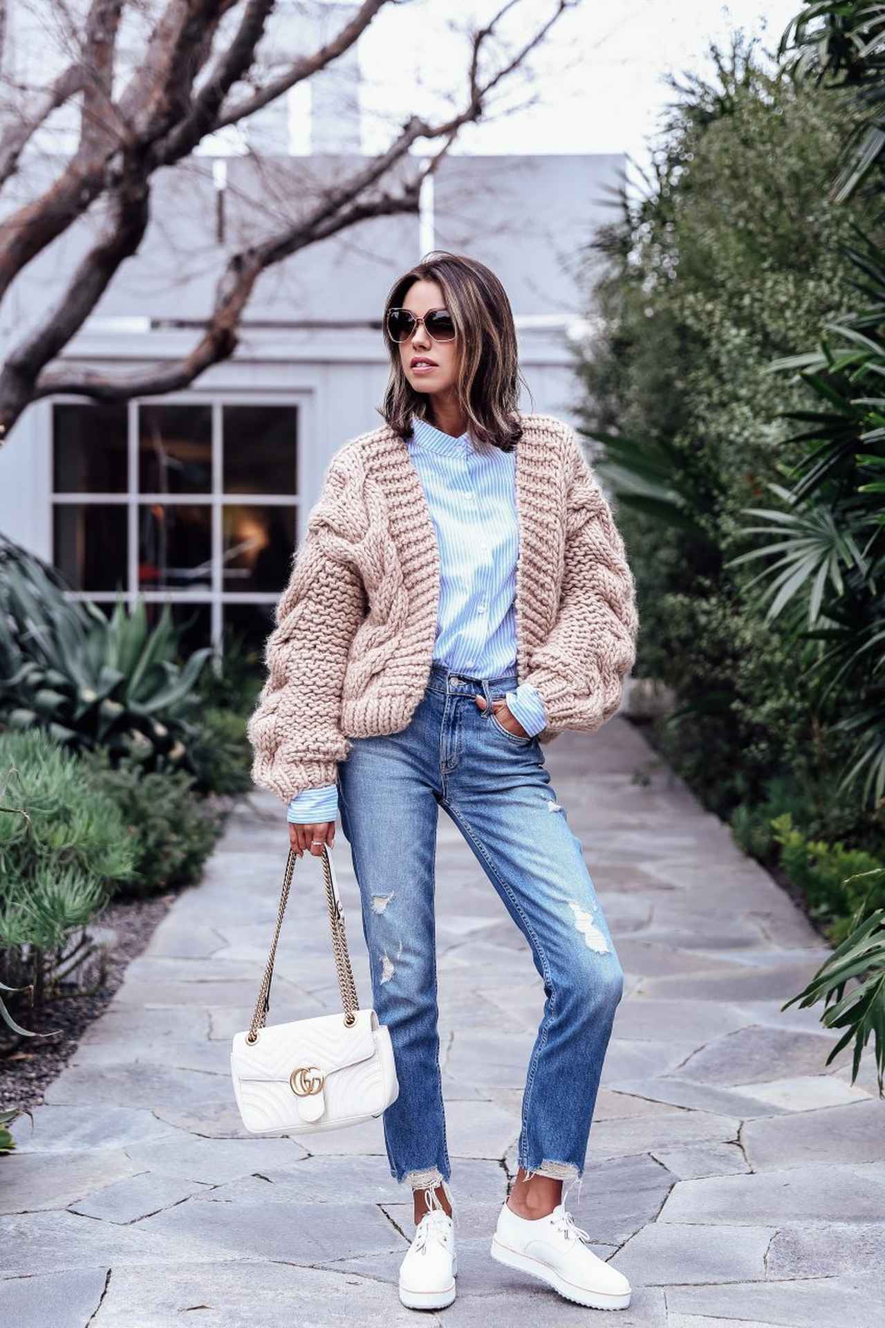 ストライプシャツにフレイドヘムが抜け感たっぷりのデニムを合わせたカジュアルな組み合わせには、ボリューミーなニットカーディガンで優しげに。GUCCIのチェーンバッグとスニーカーは白ですっきりと。