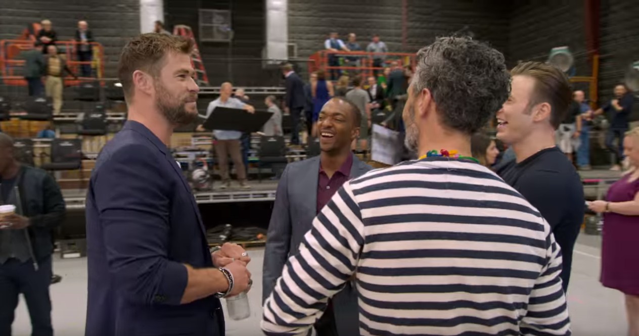 これまでのマーベル作品を支えてきたスタッフたちとの集合写真を撮影するために集められたキャストたちは、久々の再会を喜び楽しそうに談話。