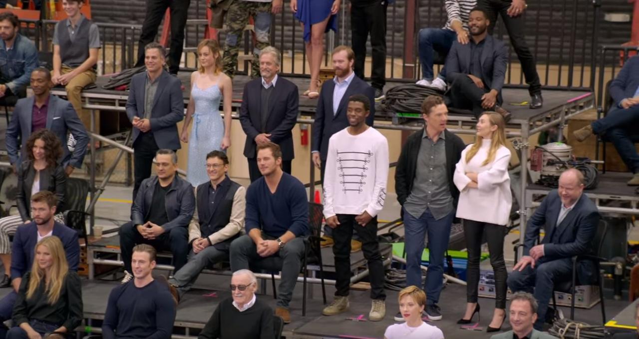 アイアンマンを10年間演じてきたロバート・ダウニー・Jrをセンターに、グウィネス・パルトロウ、クリス・プラット、エリザベス・オルセン、ベネディクト・カンバーバッチ、ジェレミー・レナー、スカーレット・ヨハンソン、ブリー・ラーソンなど、80人以上のキャストとスタッフが写っている1枚。