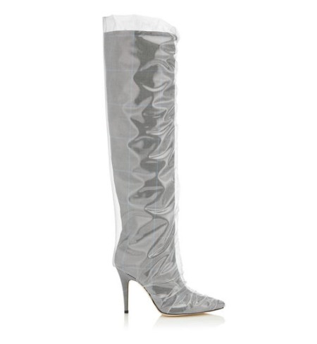 ヘイリーが着用するのは、グレーのチェックプリントのロングブーツに、ビニールがレースのように繊細にラッピングされた、フューチャリスティックなブーツ!