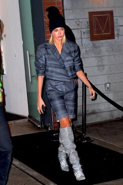 旬なモデルのヘイリー・ボールドウィンは、オフ-ホワイトのジャケットとショートパンツのセットアップに、「ジミー チュウ×オフ・ホワイト」のコラボブーツで作ったエッジの効いたIラインスタイル。