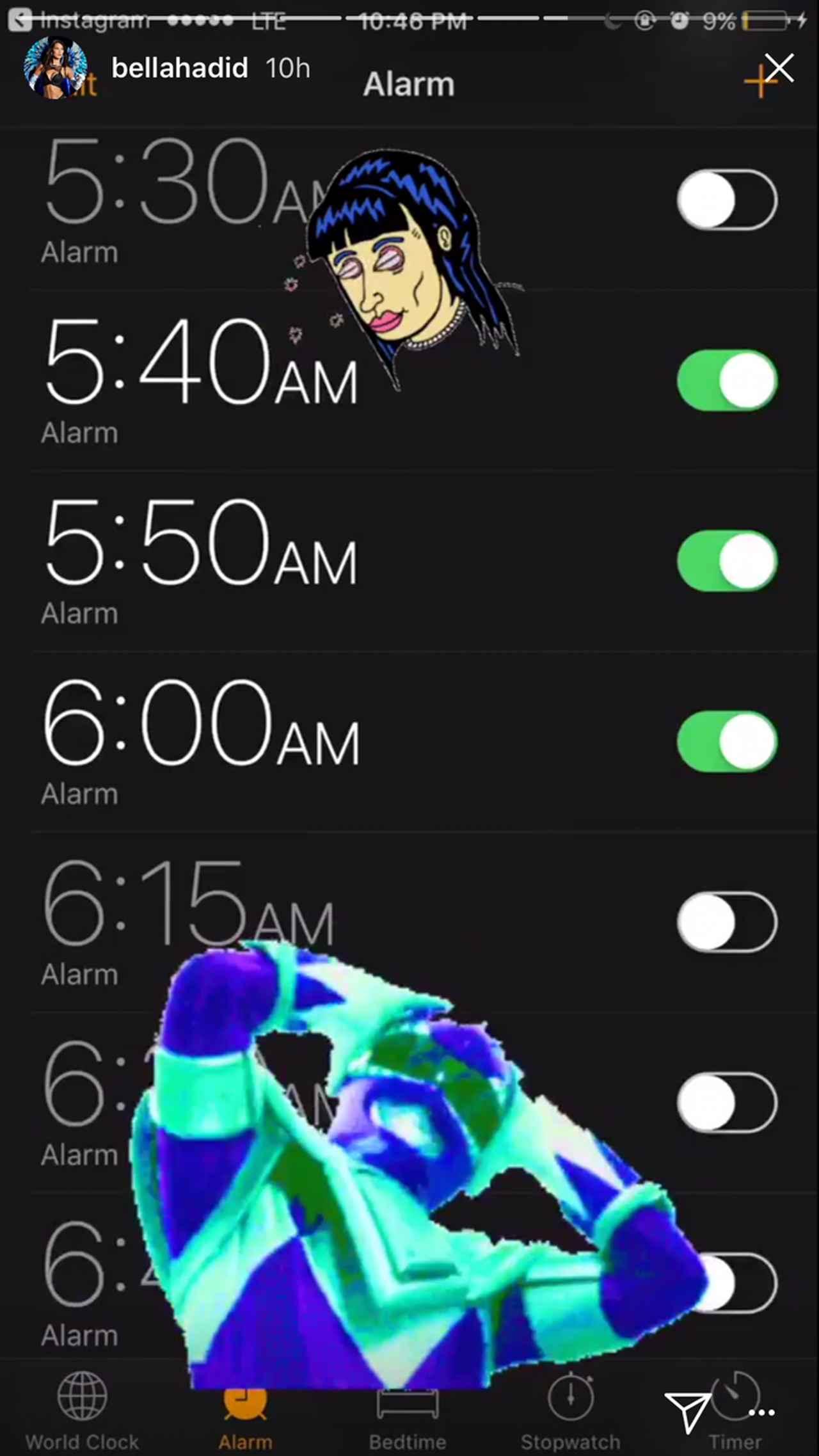 現在、米ニューヨークで開催中のファッションウィークで数々の有名ブランドのショーに出演するベラは、寝る間もないほど忙しい日々を過ごしている。大事なショーに遅刻するわけにはいかないので、アラームの設定は10分おきというカオスな状態。目玉が飛び出た女性の顔と戦隊ヒーローが頭を抱えるスタンプからは、「早起きするのがツラい」という彼女の悲鳴が聞こえてくる。