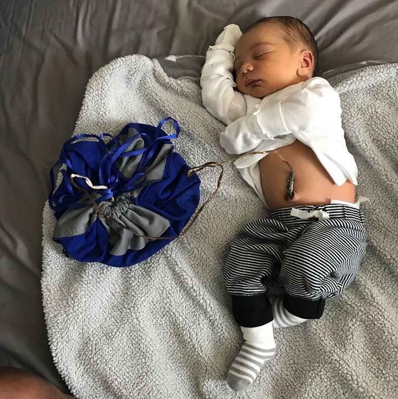 実はこれ、ロータスバースという出産法で、人の手でへその緒を切るのではなく、乾燥で自然に取れるのを待つというもの。