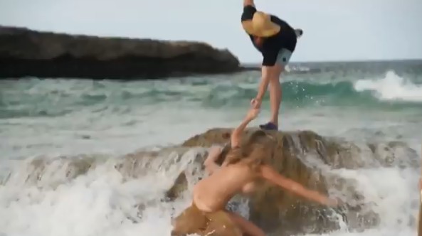 男性スタッフがケイトの側へ近づこうとした瞬間、ケイトがバランスを崩して岩場から落下! もちろん手ぶらだったため、ケイトの胸がすべてあらわに。