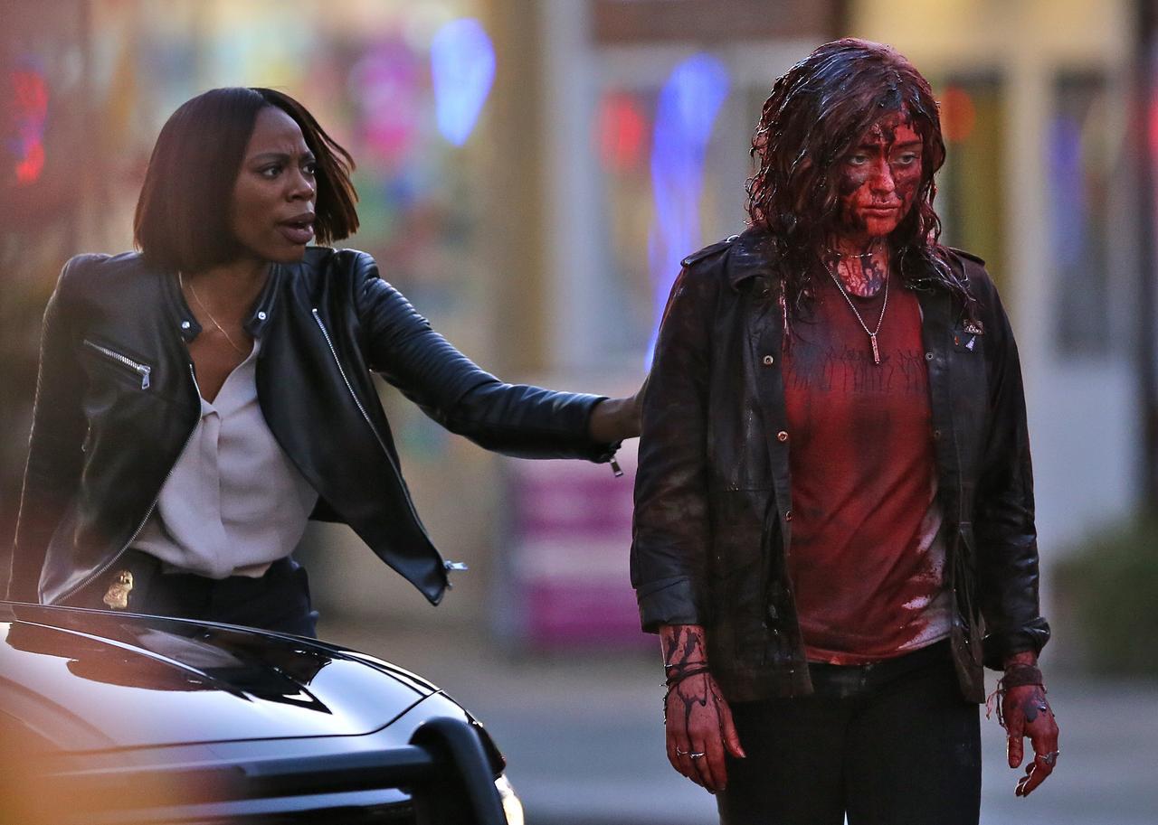 ほかのシーンでは、血まみれのキャサリンではなく、ブロンドのカーリーヘアでトラックを運転する姿も。