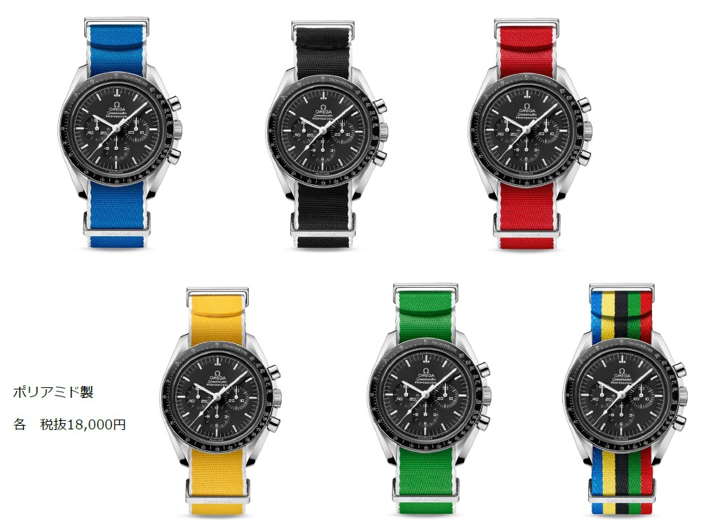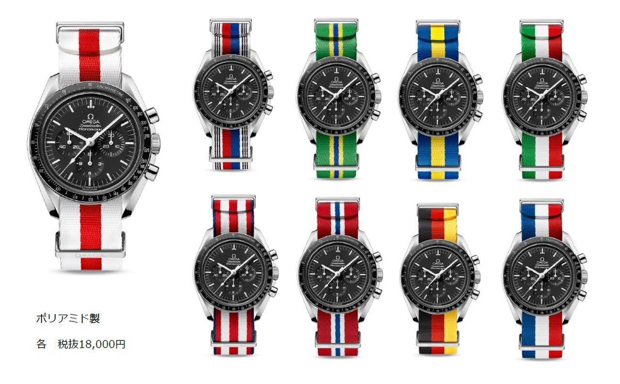国旗にインスパイアされたNATOストラップは18種類、五輪カラーにインスパイアされた新しいストラップは6種類。五輪カラーのストラップは、それぞれ、ブラック、イエロー、グリーン、ブルー、そしてレッドの5種類と、5色全てが入ったストライプのデザインとなっている。