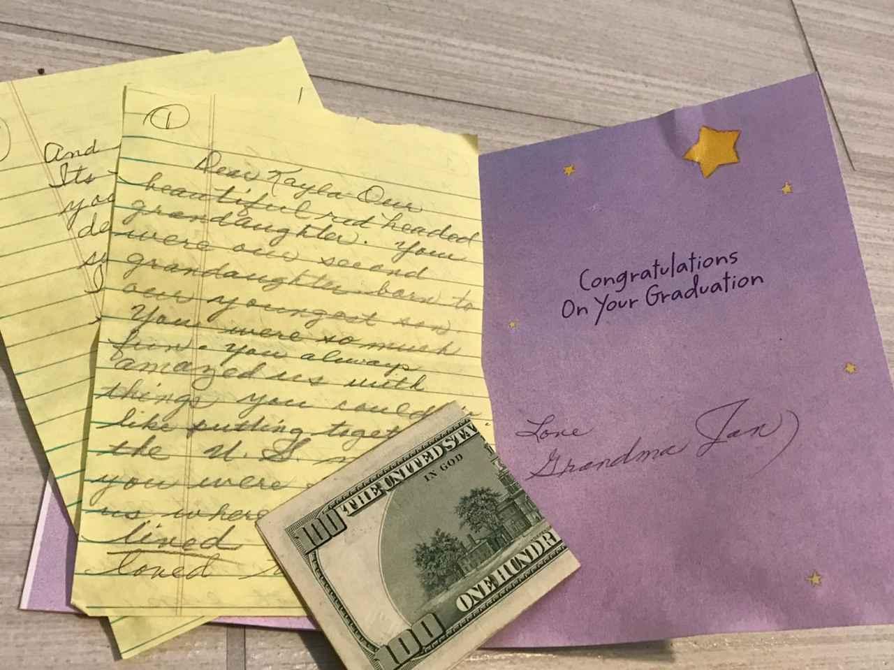 中には、手紙と「卒業おめでとう」と書かれた紙、そして100ドル札が入っていた。