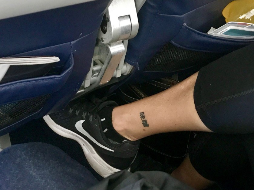 この写真をアップした男性は、「フライトで隣になった女性に、そのタトゥーは中国語と日本語で『味噌』という意味だと伝える勇気がなかった。彼女が味噌汁を本当に大好きでない限りね」とコメント。