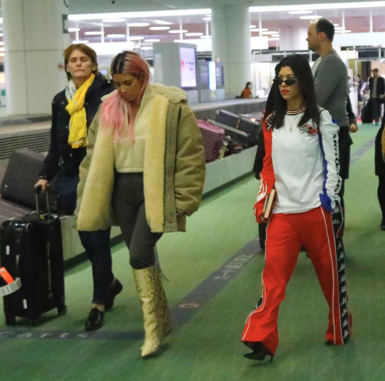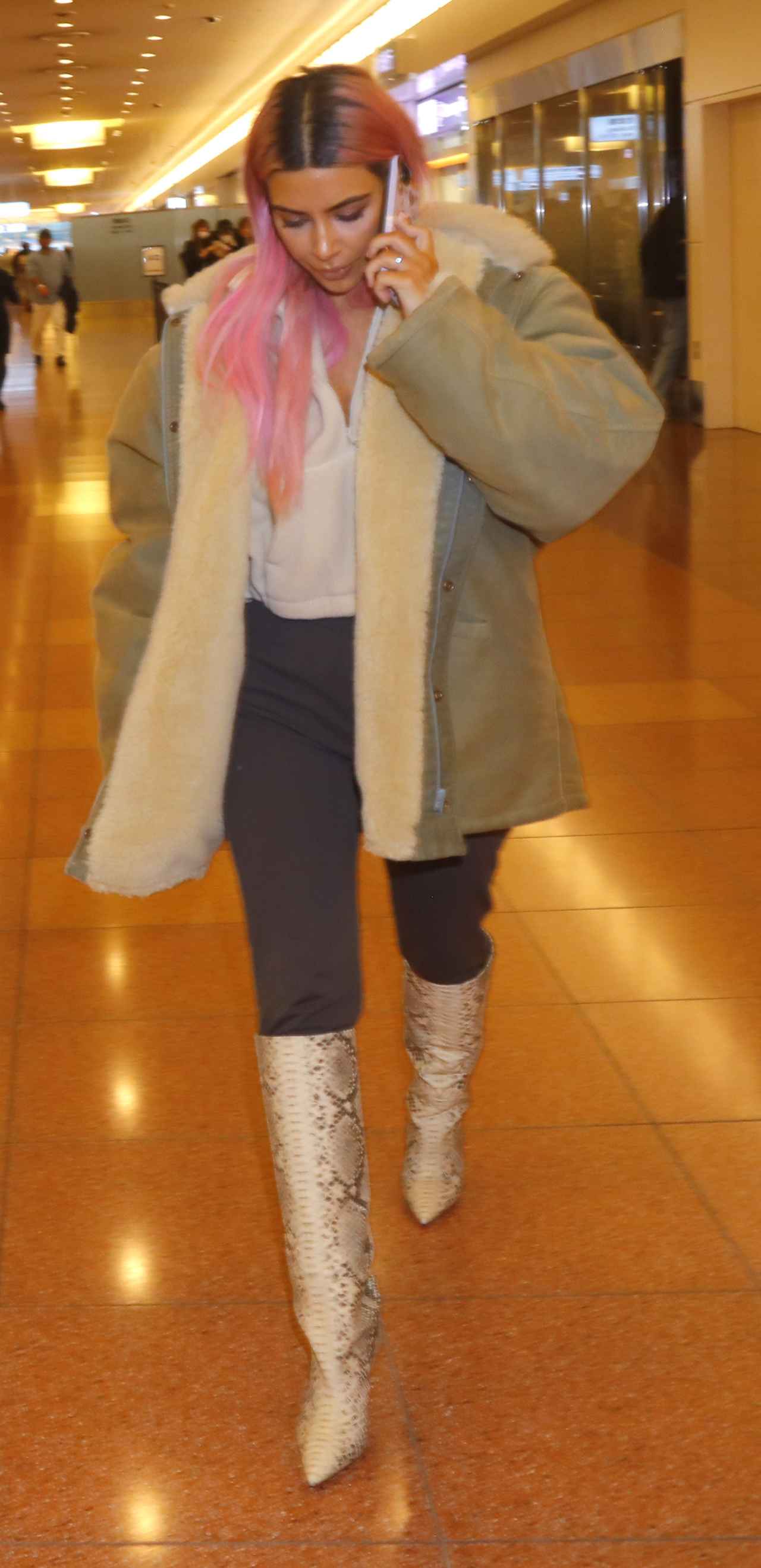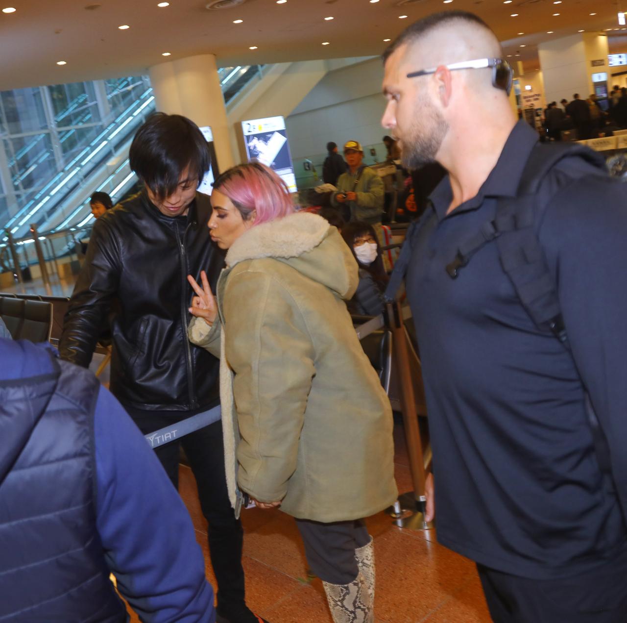前日突然イメチェンしたピンク色の新ヘアで、月曜日(2月26日)に羽田空港に降り立ったキム。姉のコートニー&妹のクロエとともに税関を抜けた彼女は、屈強なボディガードと空港職員たちに先導され到着口へ。