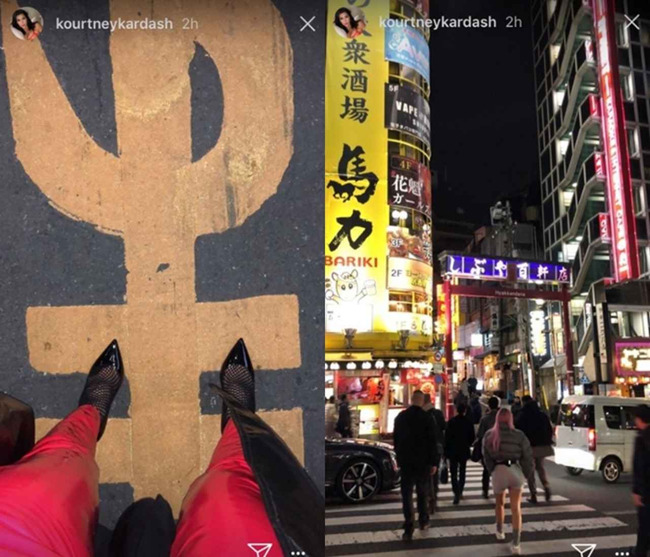 空港を出たカーダシアン姉妹は早速渋谷の街に出没。コートニーは道路に印字された「とまれ」の文字の写真や「しぶや百軒店」へと向かうキムの後ろ姿を撮影した写真をインスタグラム・ストーリーで公開していた。