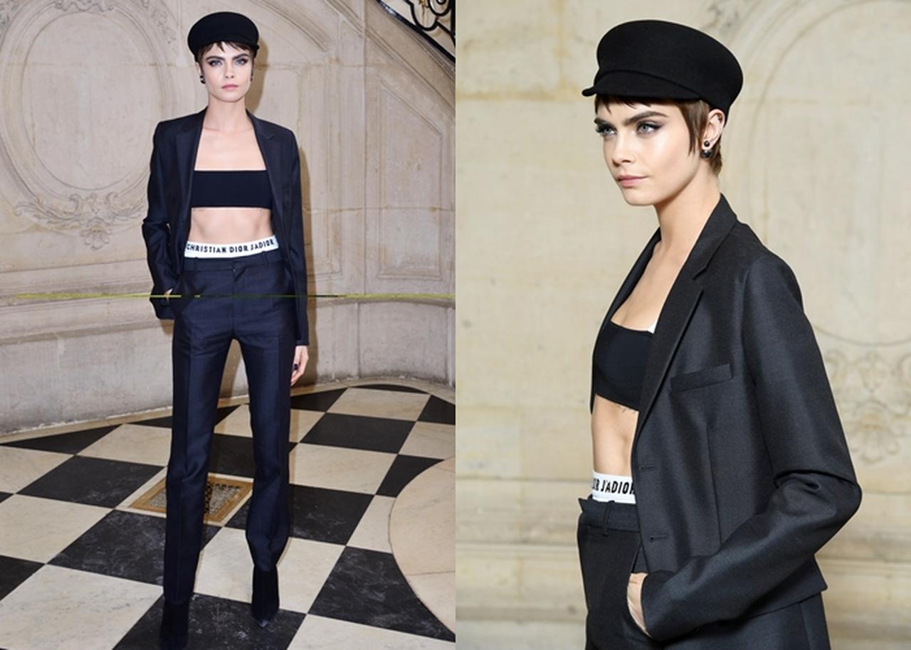 人気ブランド、ディオール(Dior)のショーを見学に訪れたカーラは、同ブランドのスーツ風セットアップからブラトップ&ロゴ入りのアンダーウェアを覗かせ、キャスケットをポイントにしたクールなスタイルで登場。