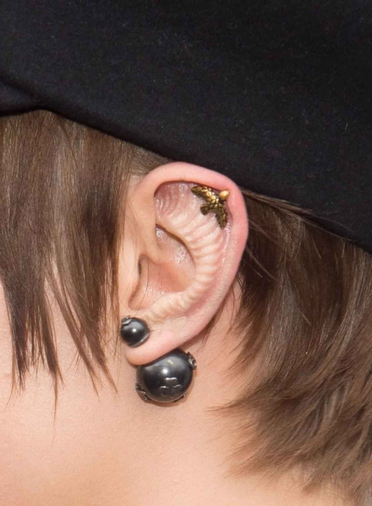 ディオールの黒パールピアスと鳥モチーフのゴールドの軟骨ピアスで飾られたカーラの耳は、まるで彼女が出演したリュック・ベッソン監督のSF映画『ヴァレリアン 千の惑星の救世主』の世界に登場するエイリアンかのようだと話題に。