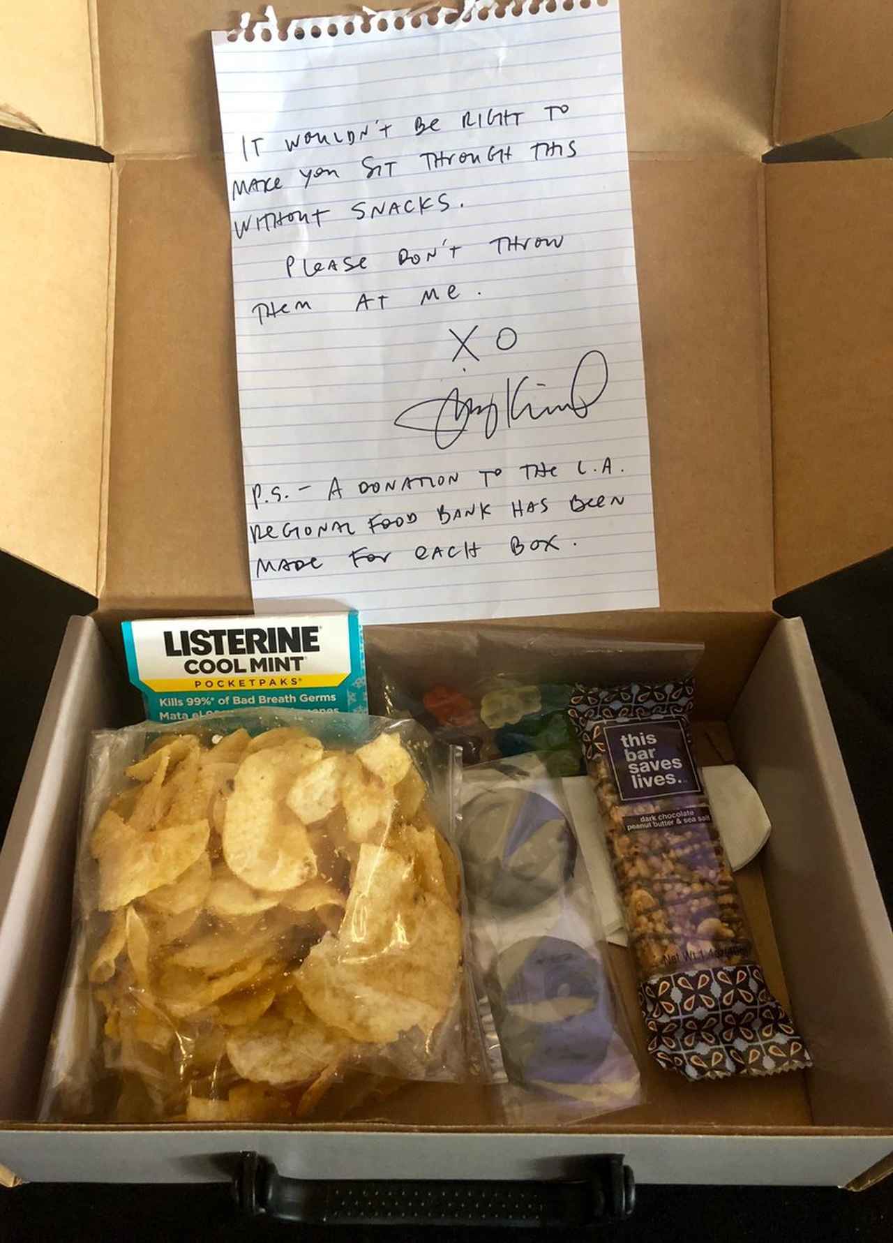 箱の中には「お願いだからお菓子を僕に向かって投げないでね」と書かれたジミー直筆のメモも入っており、金額は明らかにしていないがロサンゼルス市内のフードバンクにおやつBOX約3,400箱分の募金をしたことも記されていた。