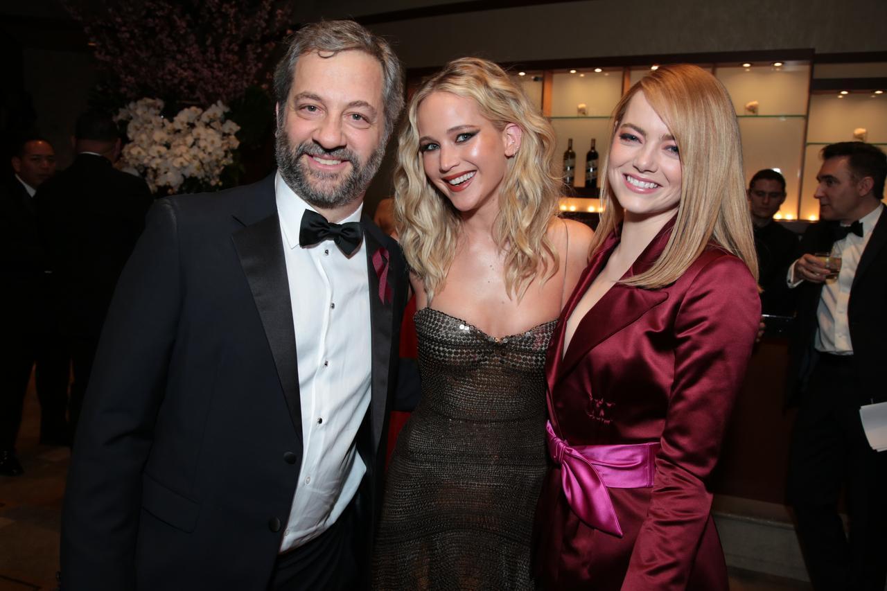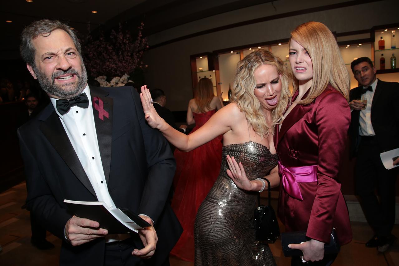 アカデミー賞の会場で、コメディ映画を多く手掛けるジャド・アパトー監督と写真撮影する人気女優のジェニファー・ローレンスとエマ・ストーンの姿を発見。