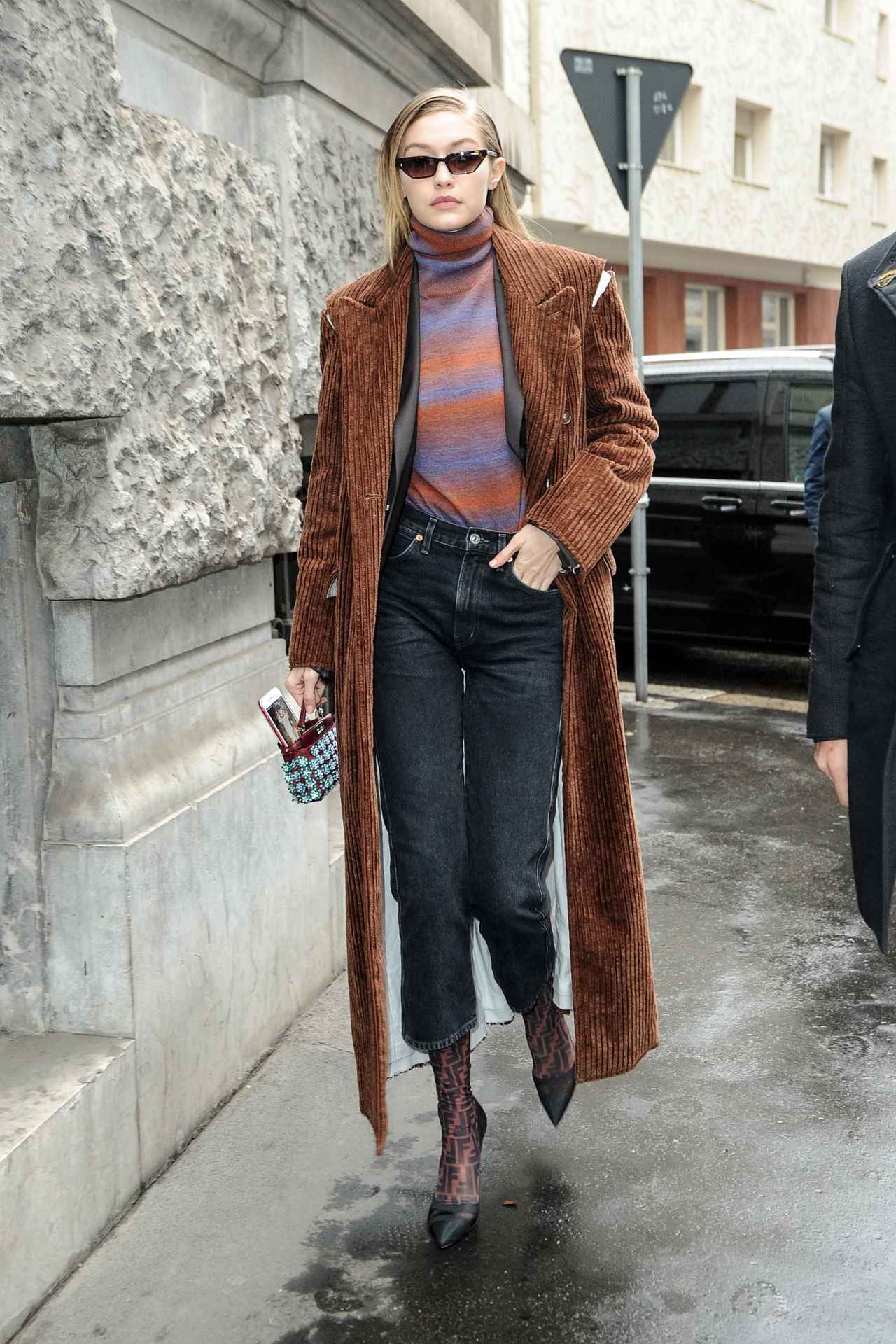 ジャケットとCHRISTIAN DADAのコーデュロイコートのレイヤードで防寒対策をはかったジジは、足元にFENDIのロゴ入りソックスブーツを投入し、クロップト丈デニムからチラりと見せて。マイクロミニバッグもFENDIのもの。