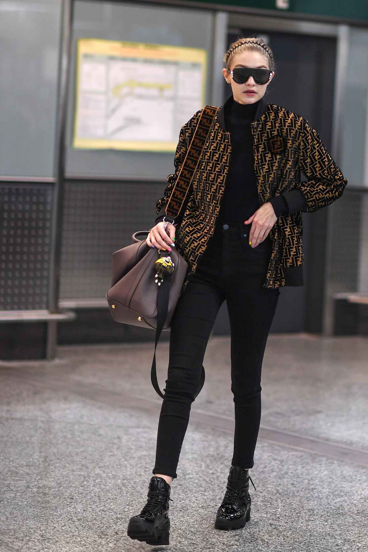 ニット、デニム、ブーツはすべて黒でミニマムにおさえ、ゴールドのFENDIのロゴボンバージャケットを引き立てて。バッグストラップやキャロリンもつけていたチャームもロゴが入っており、じつはこのバッグにもロゴが施されている。サングラスもFENDI。