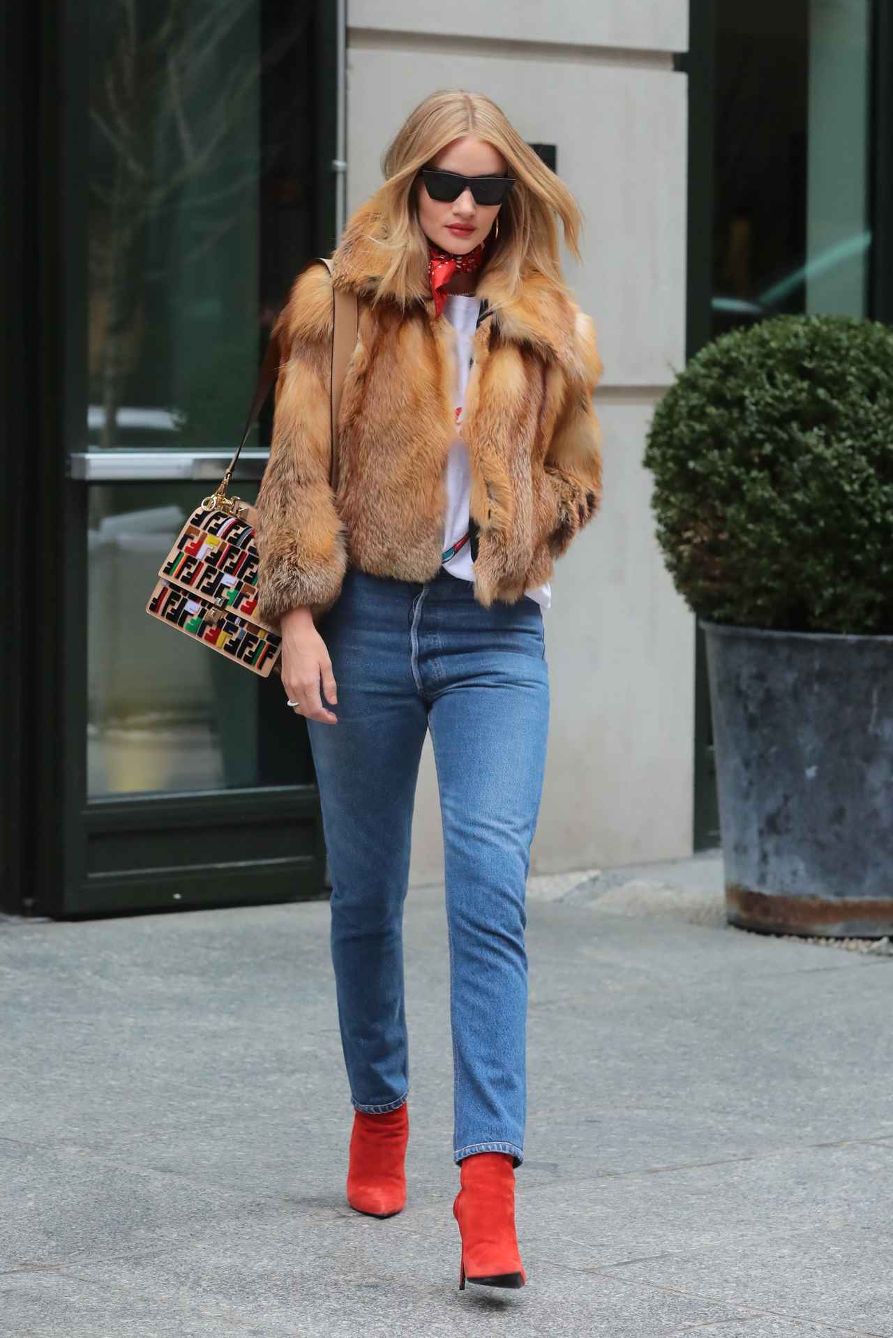 TシャツにRE/DONEのデニムというカジュアルなコーデに、A.L.C.のファージャケットでレグジュアリーに昇華。そこに、カラフルなベルベットのロゴ文字がFENDIのバッグや赤のスカーフとブーツで、小物使いも抜かりなく。
