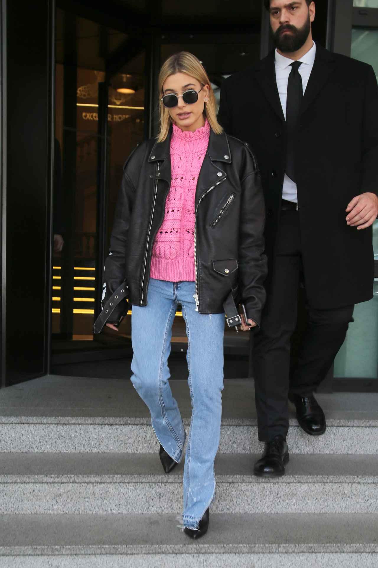 デニムと相性抜群のピンクカラーのISABEL MARANTのかぎ編みニットに、BALENCIAGAのオーバーサイズジャケットでストリート感を出したヘイリー。足元は、履き回しもできるシンプルなTONY BIANCOのミドル丈ブーツをチョイス。