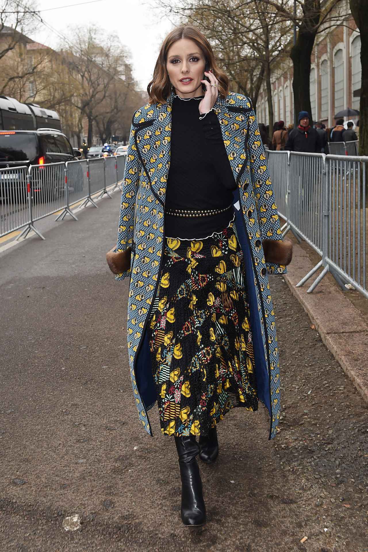 黄色のハートが全体にちりばめられたプリーツスカートとコートは、FENDIの2018プレフォールのもの。キャッチーな柄コーディネートは、白のパイピングが入ったニットと、JIMMY CHOOのロングブーツで大人なムードに。