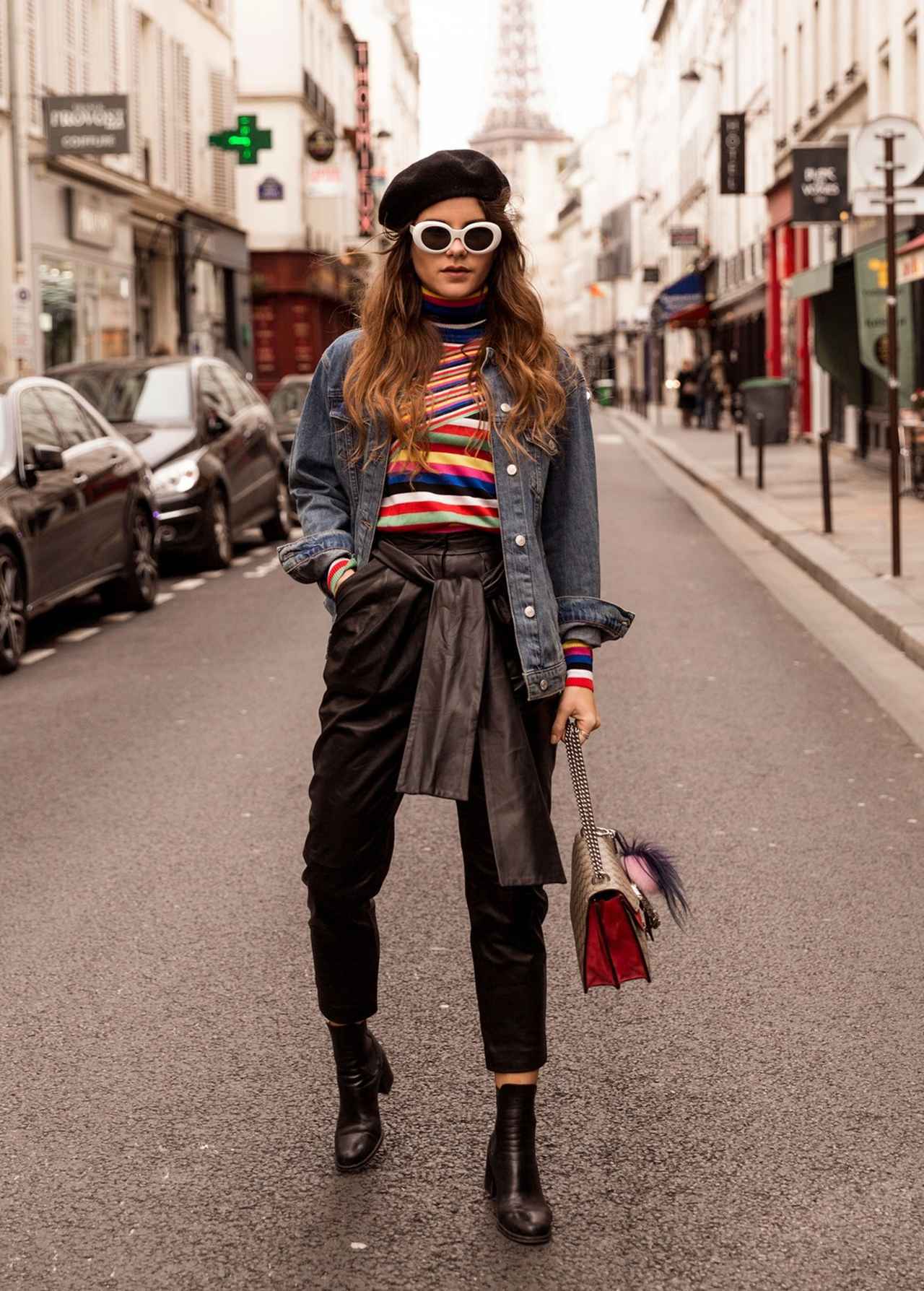 DIESELのマルチカラーストライプのニットや、TOPSHOPのベルト付きパンツという個性的な組み合わせには、シンプルなミドル丈ブーツが絶妙な引き立て役に。デニムジャケットはLEVI’S。