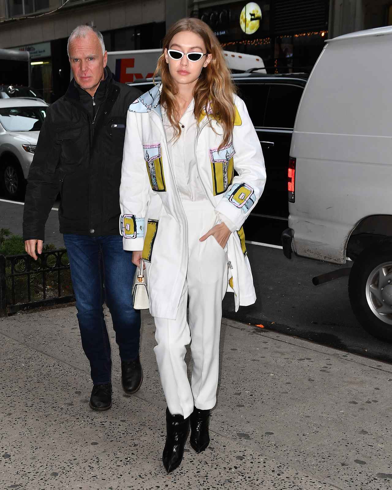 インナーの上下はARIASのシャツとパンツでそろえ、ポケットやベルトがイラスト風に描かれたEDDA GIMNESのコートでカジュアルな白コーデにまとめたジジ。そこにダウン素材になった個性的なALCHIMIA DI BALLINの黒ブーツで引き締めて。