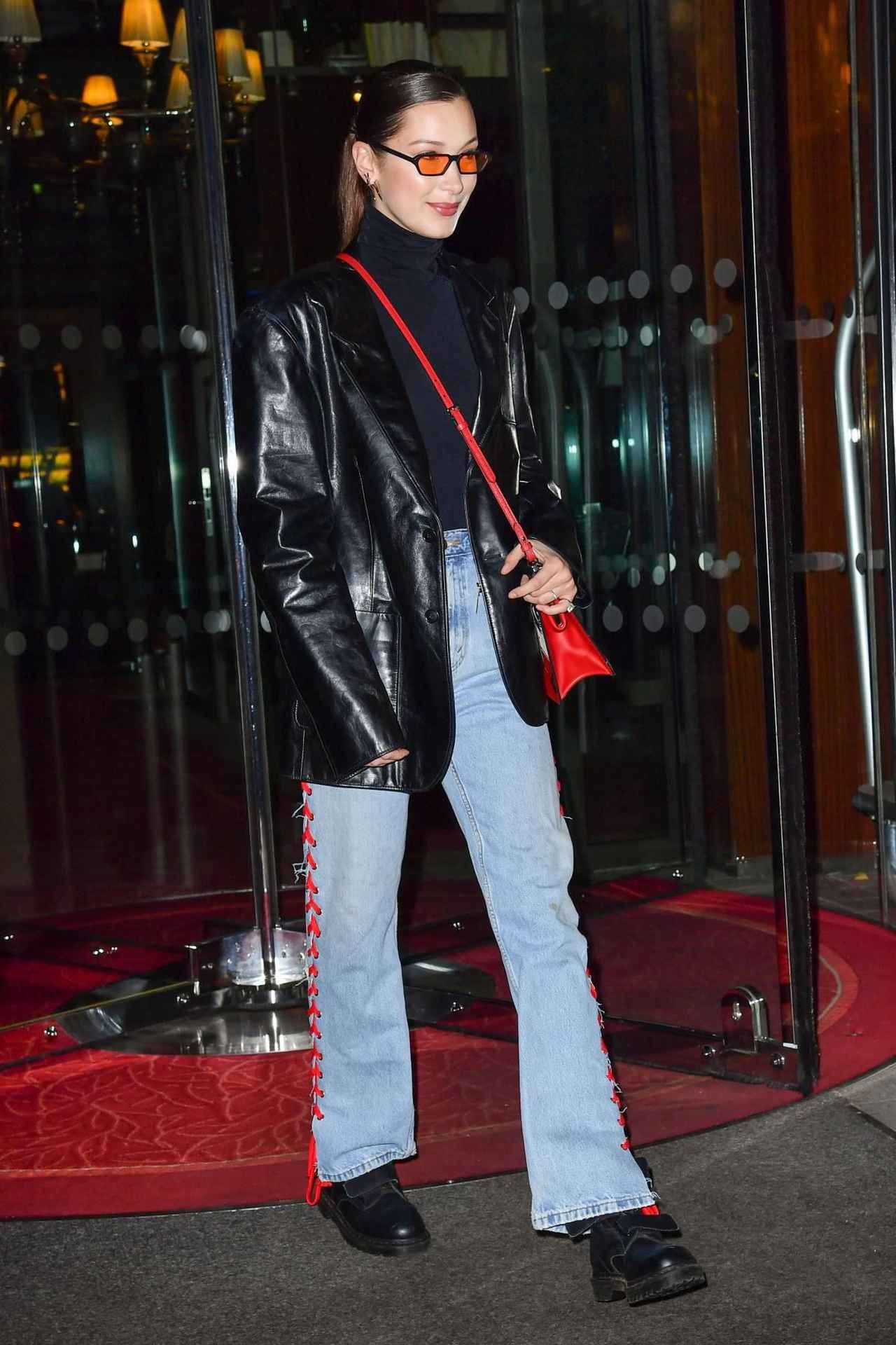 サイドに赤のレースアップがほどこされたデザインデニムと、PRADAの赤のショルダーバッグでカラーテクニックを見せたベラ。邪魔しないように、BALENCIAGAのジャケットやDr. Martensのブーツは黒でおさえて。