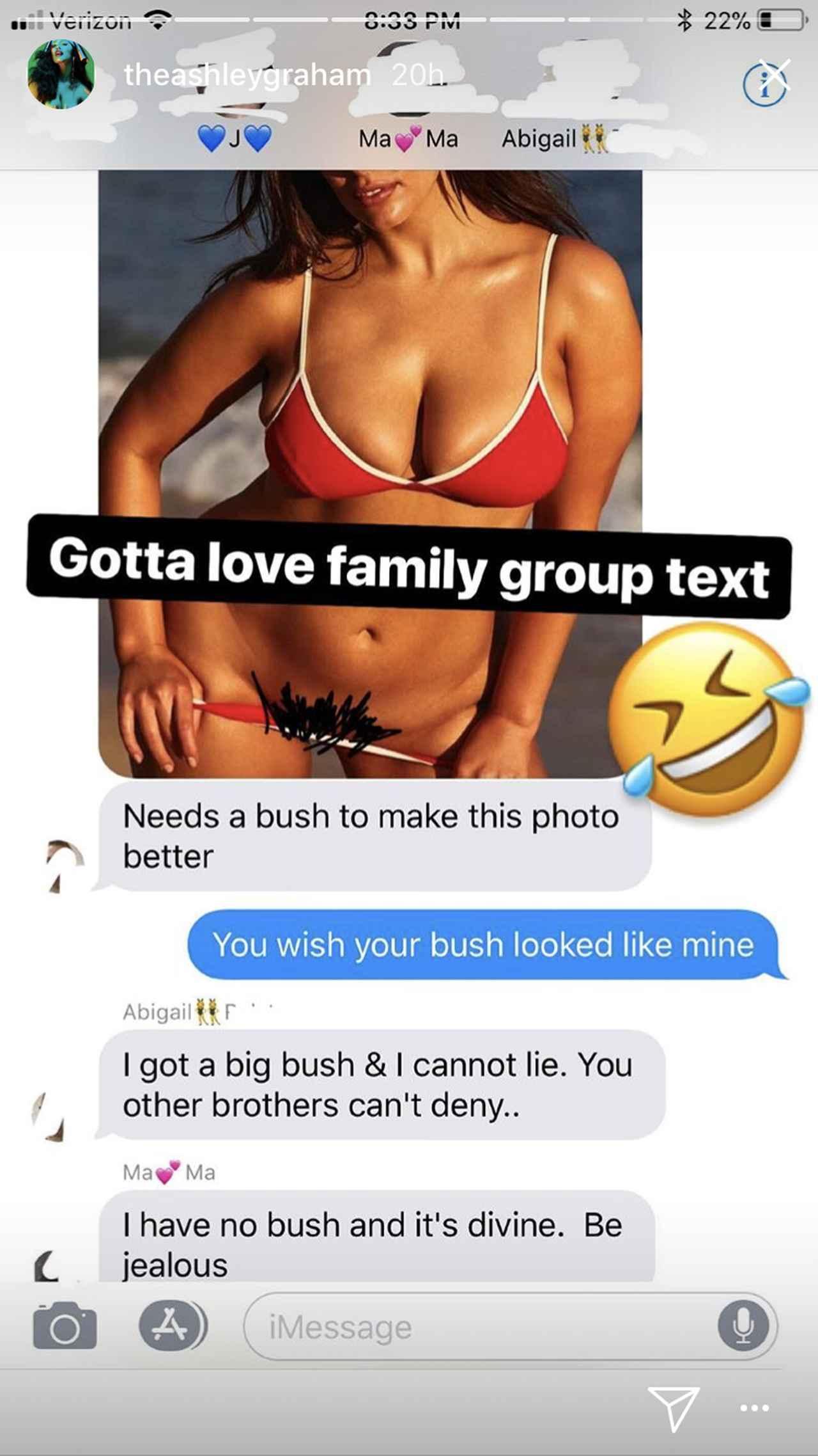 するとこれを見たアシュレイの家族が反応し、アシュレイの夫であるジャスティン・アービンとアシュレイの母、妹アビゲイルが一緒に入っている家族チャットが動き出した。アビゲイルがアシュレイの水着写真にアンダーヘアを自分で画像修正して、「この写真をもっと良くするために、アンダーヘアが必要ね」とメール。