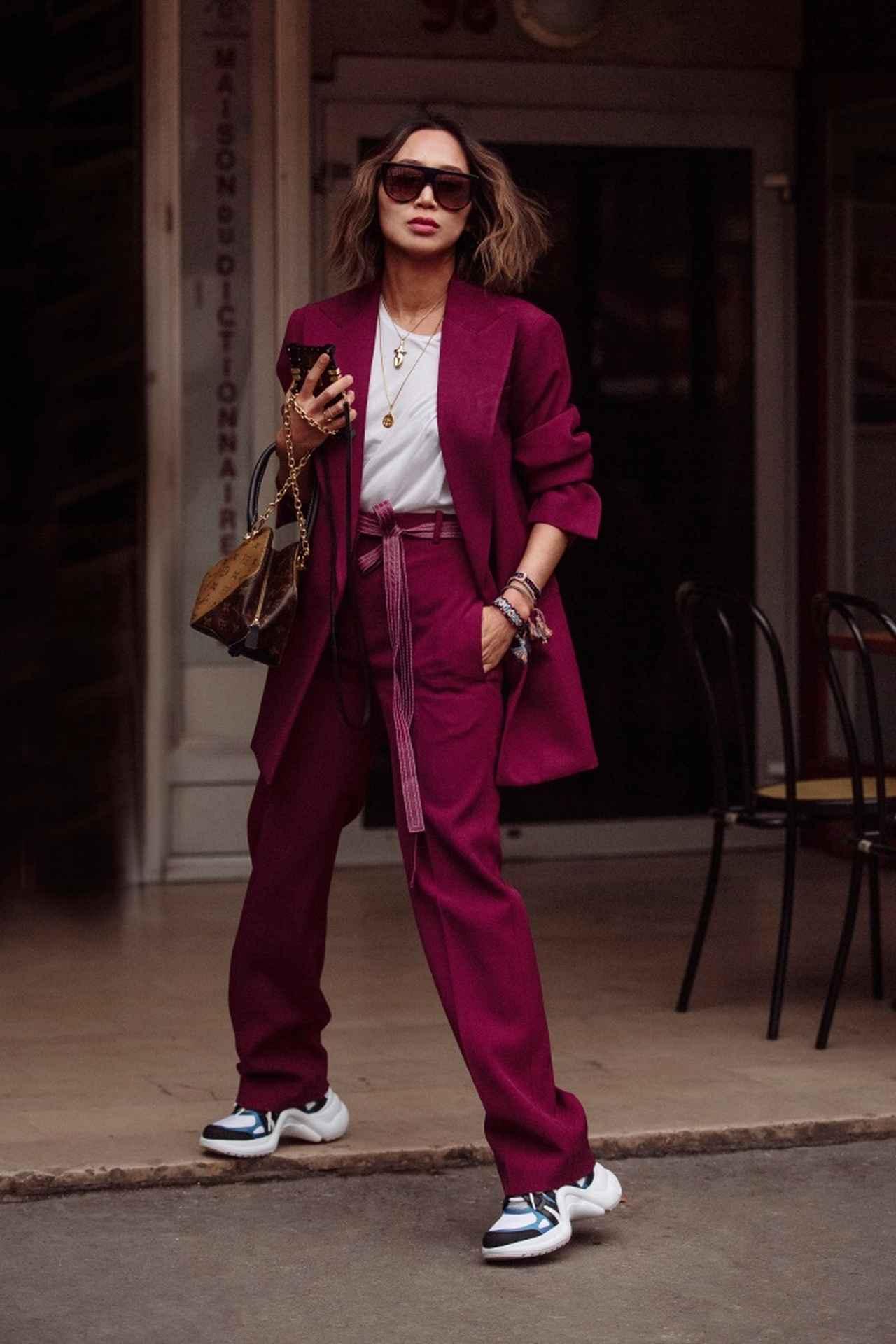 人気ブロガーのエイミーは、CÉLINEのワインレッドカラーのスーツをチョイス。そこに、LOUIS VUITTONのダッドシューズをハズしアイテムとして投入。袖をまくってミサンガを重ね付けし、小物で周りと差を付けて。