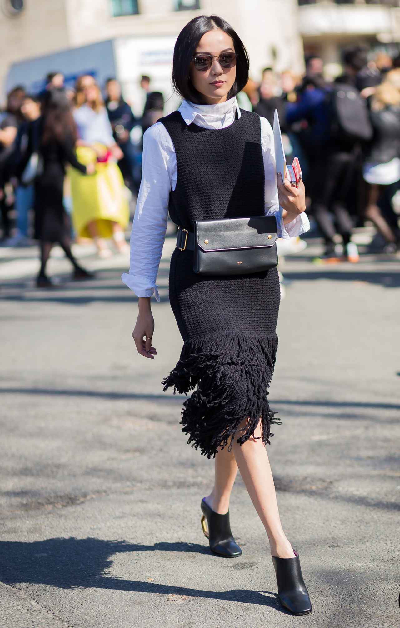 白シャツとタートルネックを重ねたヨーヨーは、そこにさらに裾がフリンジになったニットワンピをレイヤード。仕上げにベルトバックをセットしてウエストマークし、一気にトレンド顔に。