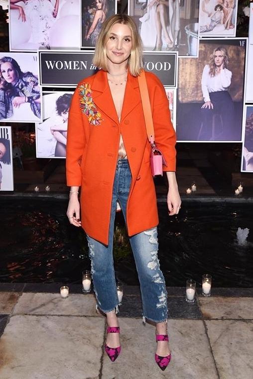 ホイットニーは、メンズライクなダメージデニムとビジューで飾られたオレンジのジャケットに、バッグとパンプスはピンクで女らしさをミックスした彼女らしいスタイルに仕上げて。