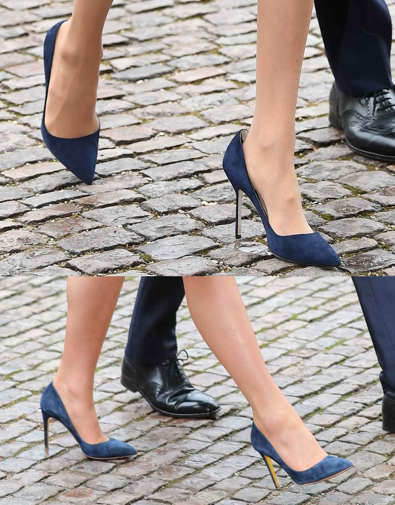 このおしゃれなおそろいコーデだけでも注目度は高いものの、人々の視線は2人の靴に集中! ネイビーのスエードのポインテッドトゥパンプスを履いている2人だけれど、どうみても同じ靴にしか見えない。しかし、じつはこの靴は違うブランドのもの。