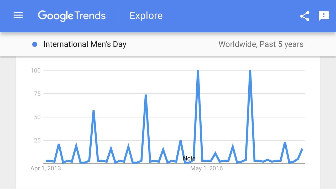 「国際男性デー」の検索率は、毎年3月になると本来の11月より多く検索され、国際女性デーの当日である3月8日にはその検索率がピークに達するということが、ジャーナリストのパーカー・モーリーによって明らかになった。