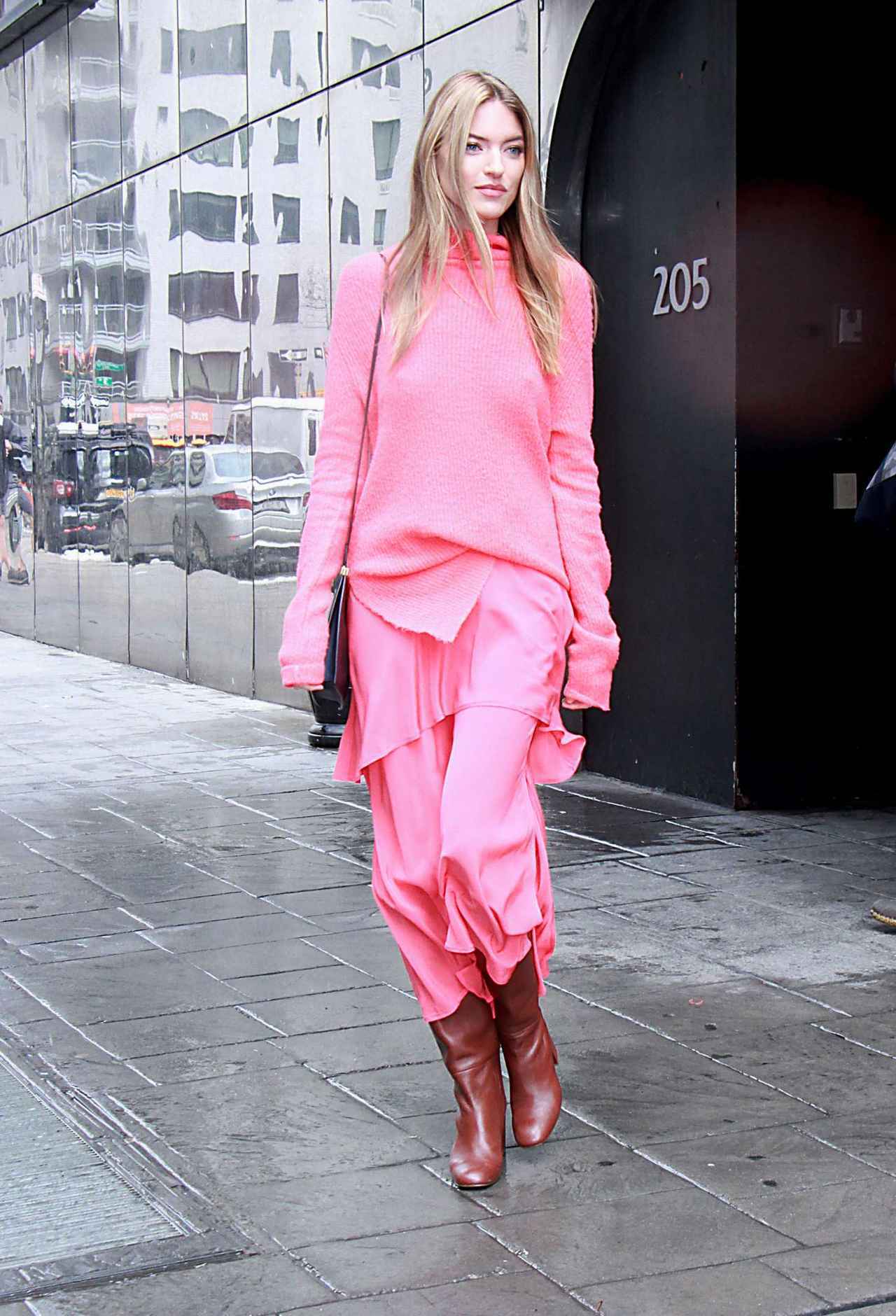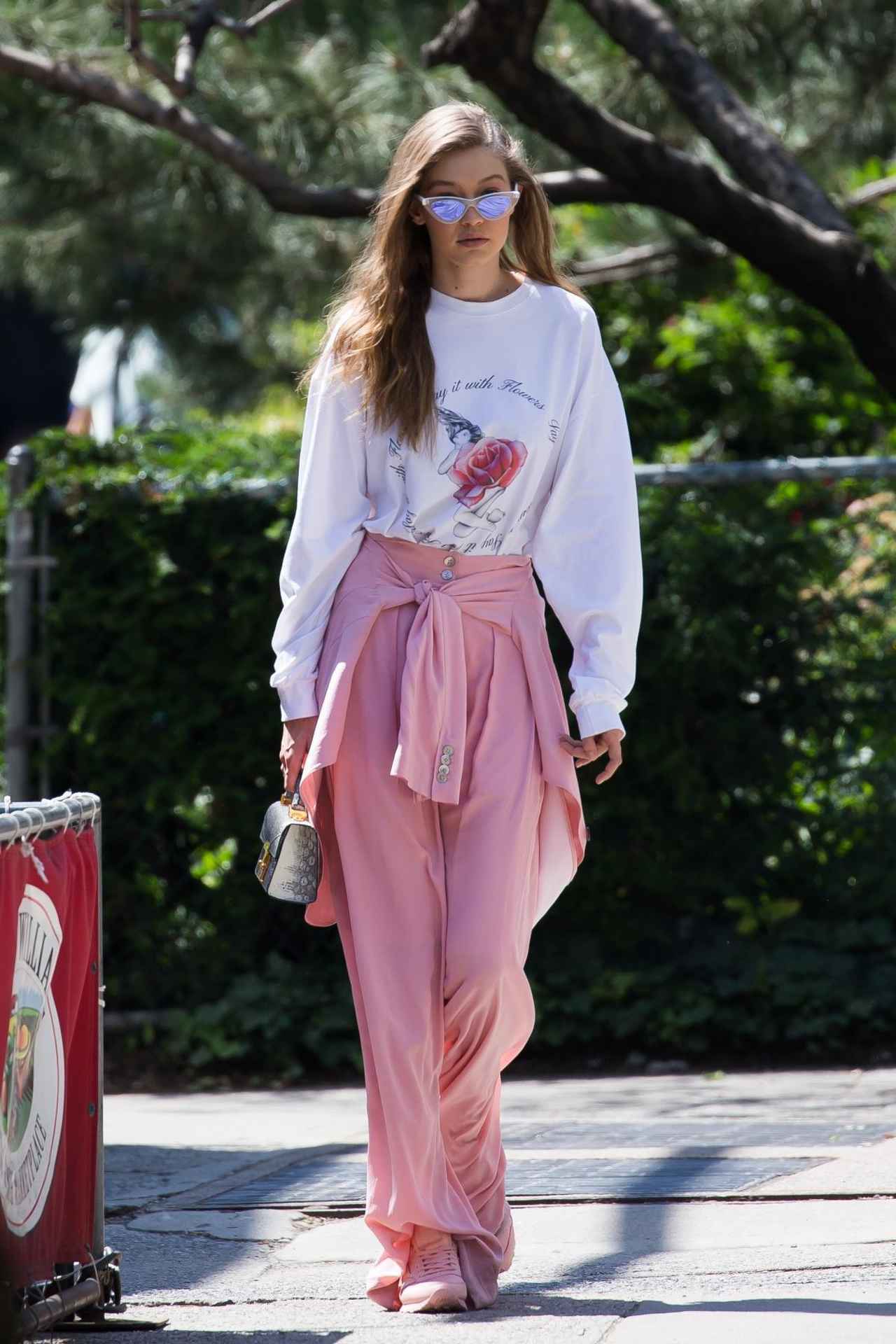ロングTシャツにピンクのトラウザーをセットして、ジャケットを腰巻きしたクールなスタイリングのジジ。ジャケットはあえて、きゅっとキツめに結んだのがこなれて見えるポイント。