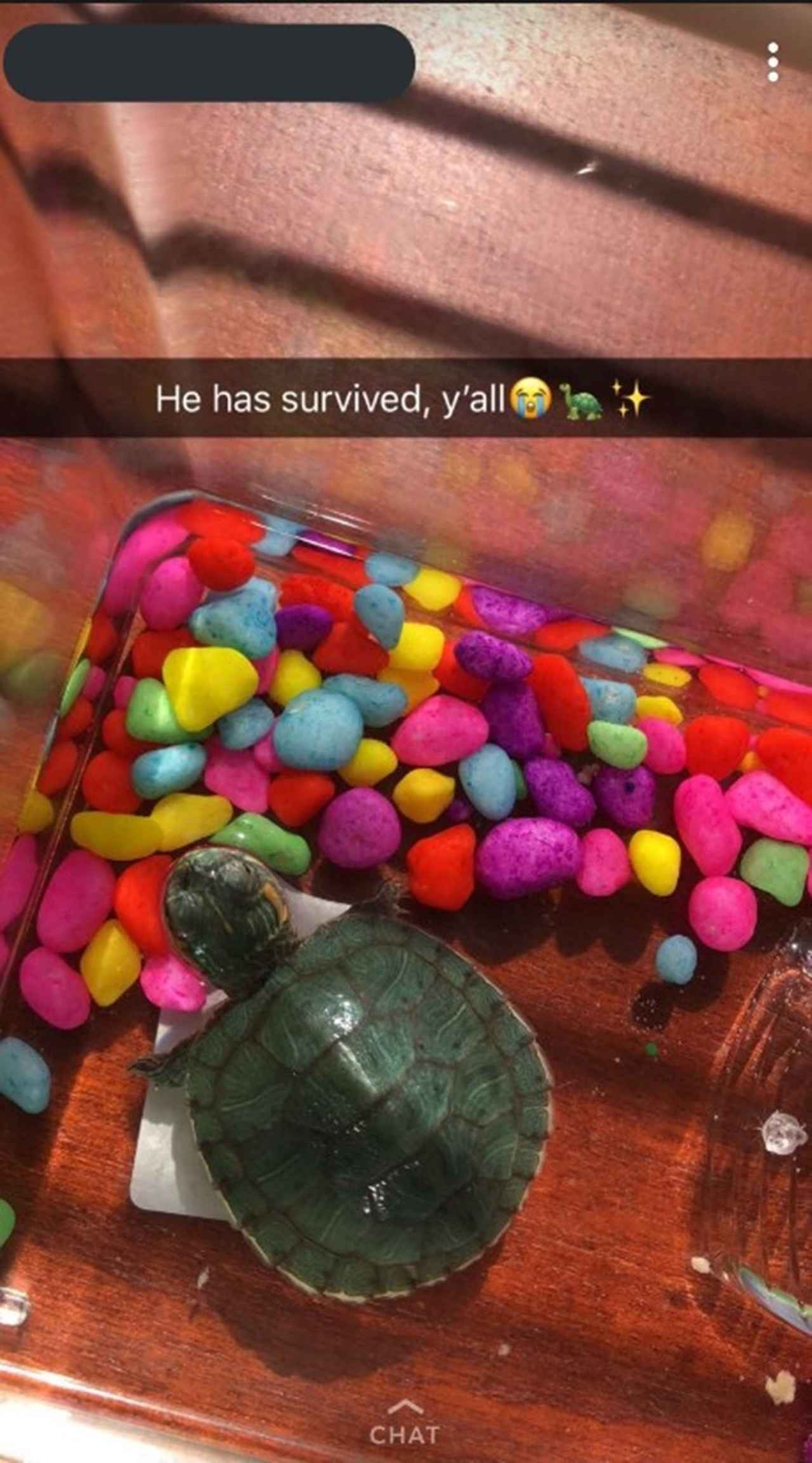 一度は氷の中で生死をさまよった亀は奇跡の復活を遂げ、何事もなかったかのようにカラフルな水槽のなかで過ごしている。