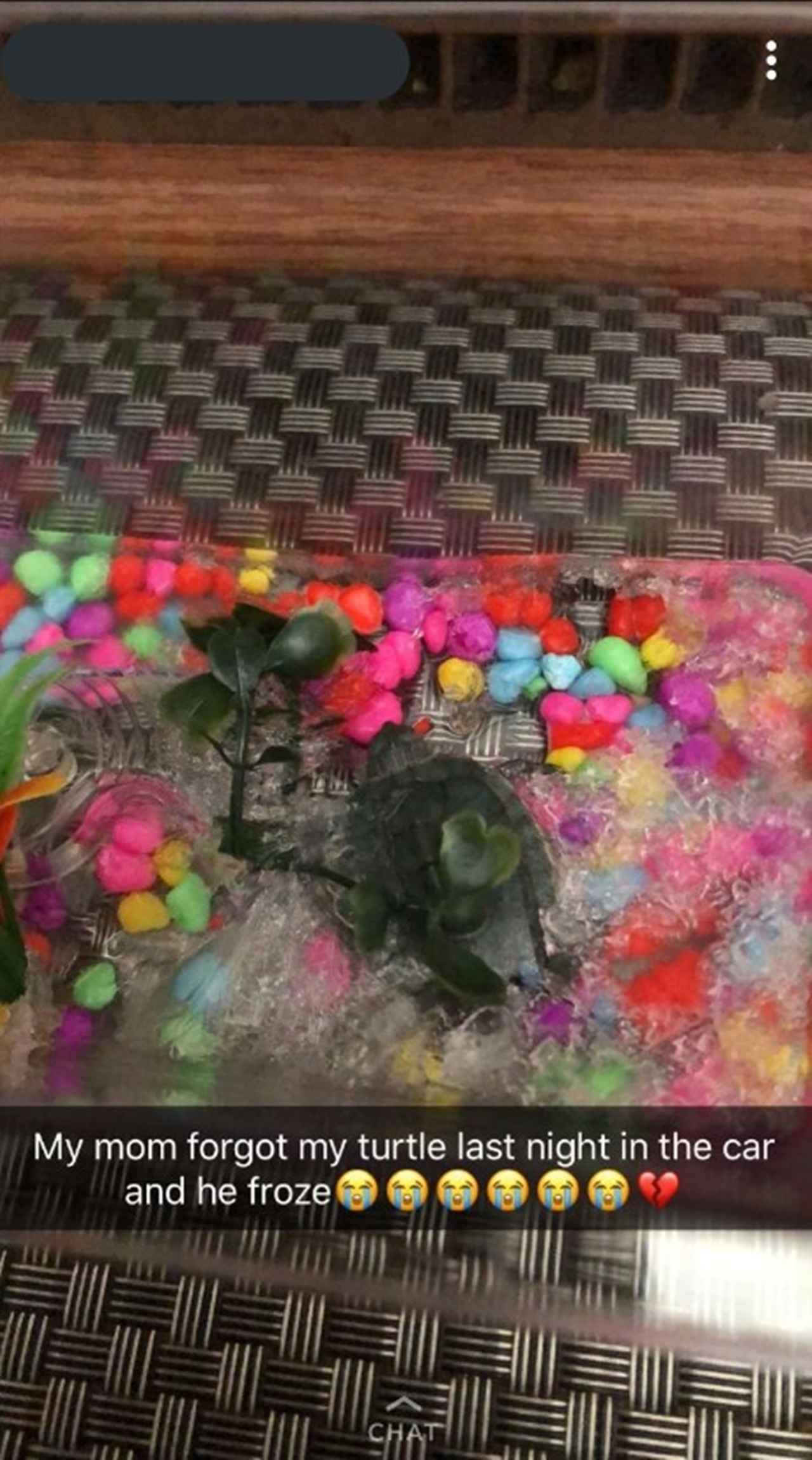 翌日、そのことに気がついた家族が車の中を覗いてみると、暖房もない寒い場所に置かれていた亀は水と一緒に凍っていた。