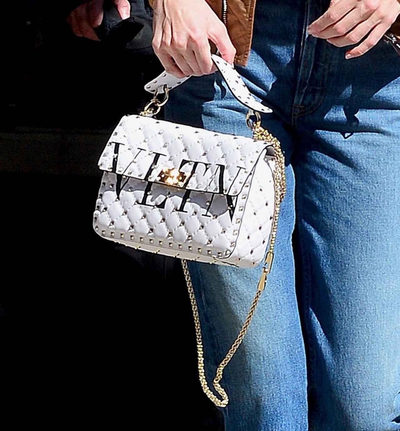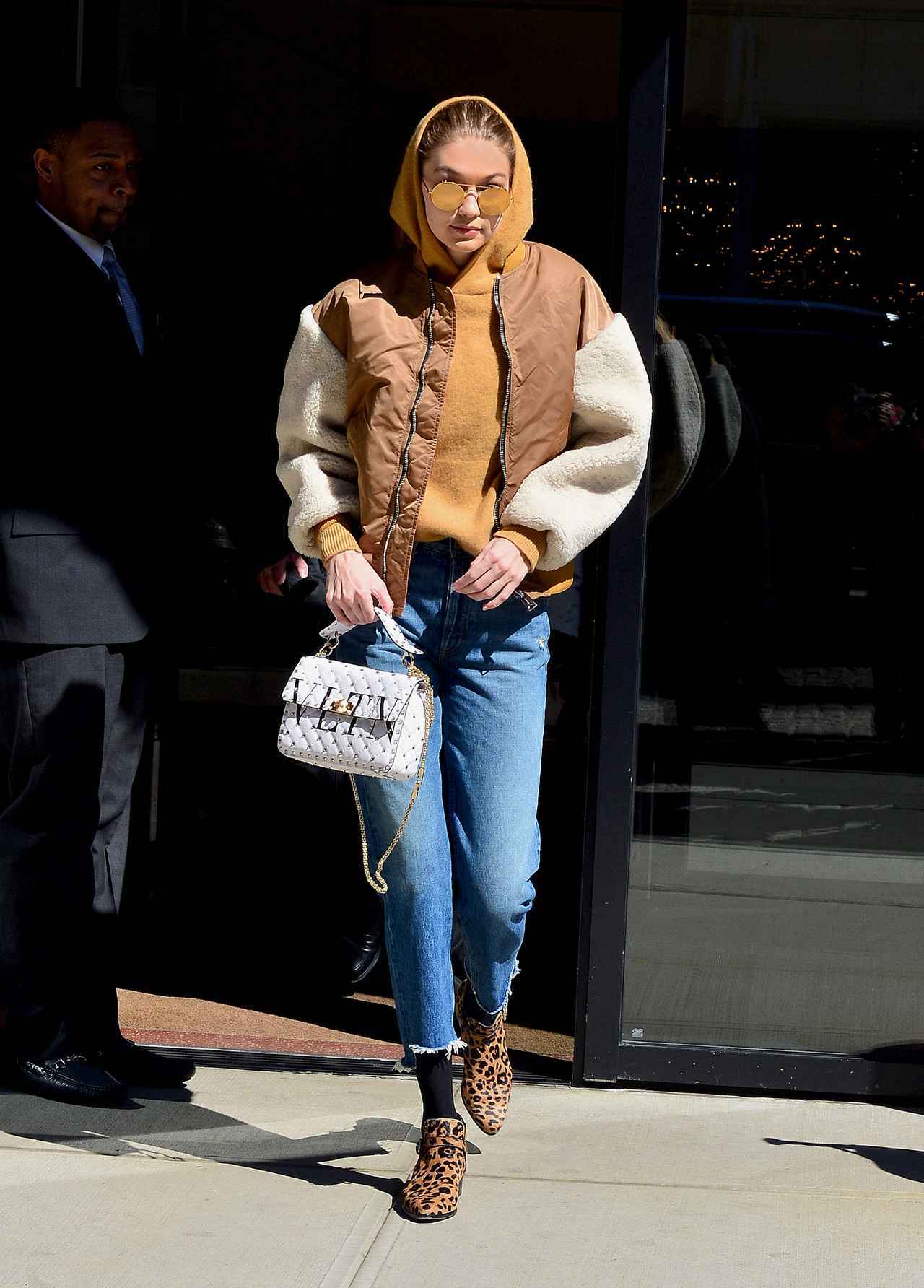 イエローベージュのフーディになじむキャラメル色のジャケットを合わせたジジは、クロップト丈のフレイドヘムデニムでカジュアルに。そんなジジが手に持つのは、イタリア発のVALENTINOのスタッズ付きハンドバッグ。