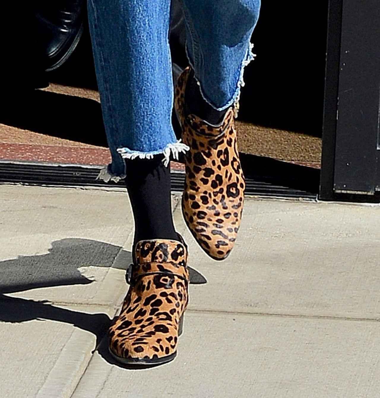 足元は、レオパード柄のアンクルブーツでスパイスをプラス。まだ肌寒いニューヨークなので、タイツを履いて防寒対策も。