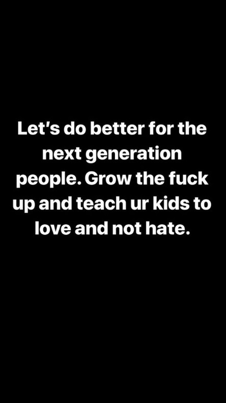 「次の世代へもっと良いことをしましょう。もっと大人になりなさい。子供たちに教えるのは愛です。ヘイトではありません」