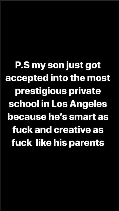 「ちなみに、私の息子はLAで一番の名門学校に合格しました。なぜなら彼は、両親に似てとっても頭がよくクリエイティヴだからです」