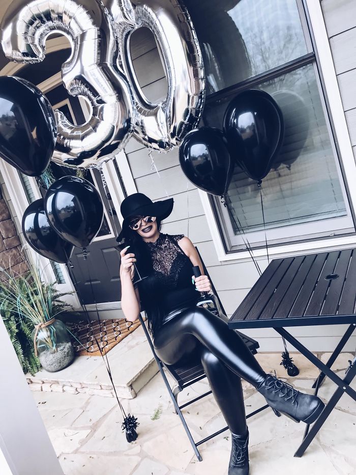 黒い衣装を身に纏い、黒い口紅を塗ったミラは、「30」を表す数字バルーンと真っ黒な風船を背にして黒いドリンクで乾杯。