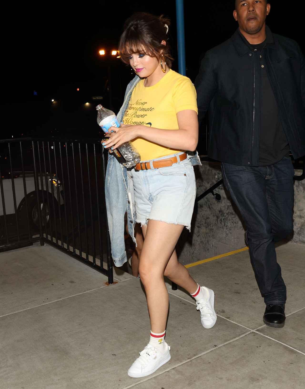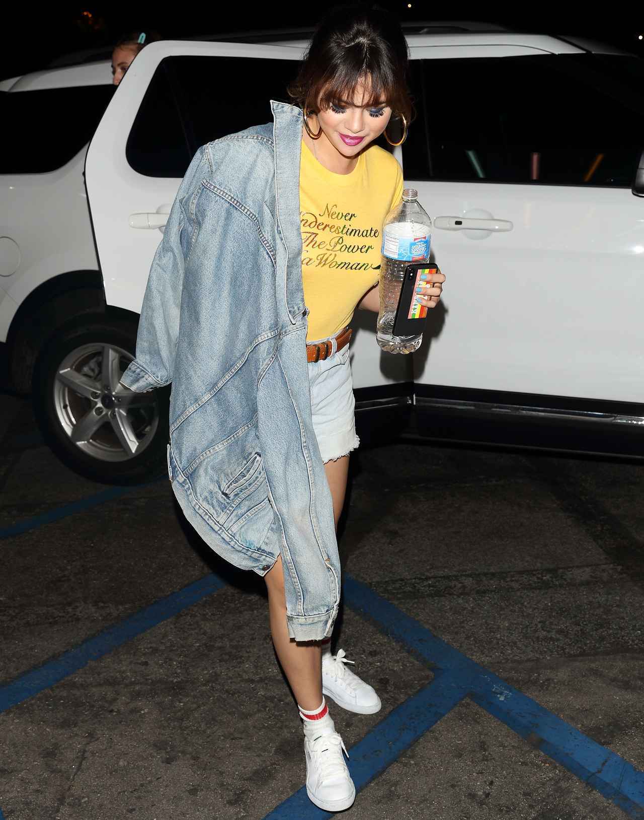 デニムジャケットとデニムのショートパンツというカジュアルな装いで姿を現したセレーナは、あるメッセージが書かれた黄色のTシャツを着用。そのTシャツには「Never underestimate the power of a woman(1人の女性の持つ力をバカにしないで)」という文字が。